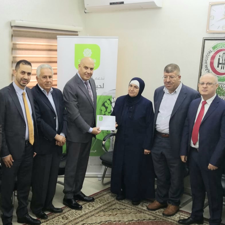حيث قام صلاح هدمي الرئيس التنفيذي لبنك القدس بتسليم شيك التبرع الى "هدى عبد النبي النتشة" رئيس مجلس إدارة الجمعية بحضورعدد من مدراء البنك وإدراي وأطباء المستشفى.