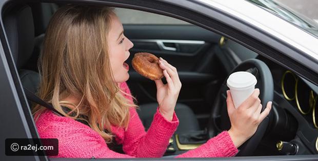 يقوم الكثير من السائقين بتناول الطعام أثناء القيادة، وهذا التصرّف يُعتبر أيضاً من التصرفات التي تشتت تركيز السائق. لذلك من المفضل عند الحاجة لتناول الطعام، ركن السيارة في مكان آمن وتناول وجبة الطعام بهدوء ومن ثم متابعة السير.