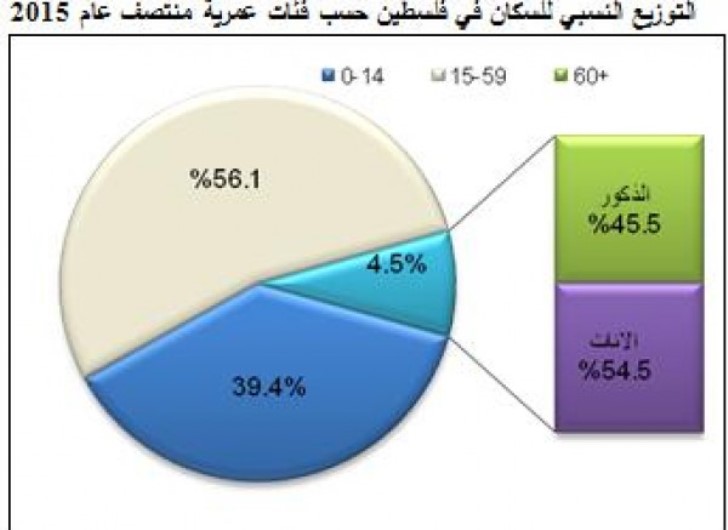 فقد بلغت نسبة كبار السن 60 سنة فاكثر 4.5% من مجمل السكان منتصف العام 2015، بواقع 4.9% في الضفة الغربية و3.8% في قطاع غزة.