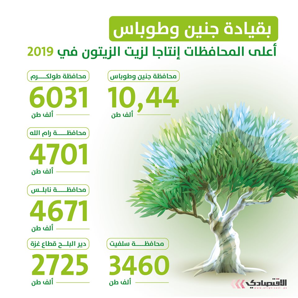 وجاء في بيانات للجهاز المركزي للإحصاء الفلسطيني أن محافظة جنين وطوباس، تصدرت المدن الفلسطينية، الأكثر إنتاجا لزيت الزيتون خلال الموسم الماضي 2019.