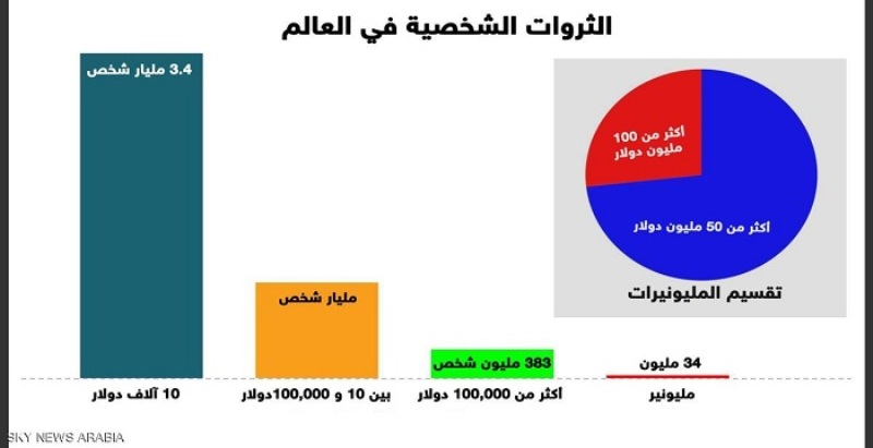 وحسب التقرير فإن أكثر من 70 % من سكان العالم (حوالى 3.4 مليار شخص) لا تصل ثروة الواحد منهم إلى 10 آلاف دولار، بينما خمس سكان العالم (حوالى مليار شخص) يقع نطاق ثروتهم ما بين 10 و100 ألف دولار.يتبقى من سكان العالم 383 مليون شخص تزيد ثروة الواحد منهم عن مئة ألف دولار، من بينهم 34 مليون مليونير.ومن بين هؤلاء 123 ألف و800 شخص تزيد ثروة الواحد منهم عن 50 مليون دولار، و45 ألفا تزيد ثروة الواحد منهم عن مئة مليون دولار.واعتمد التقرير قياس الثروة بما يملكه الشخص من أصول، كقيمة العقارات والأسهم وغيرها، باستثناء الديون.