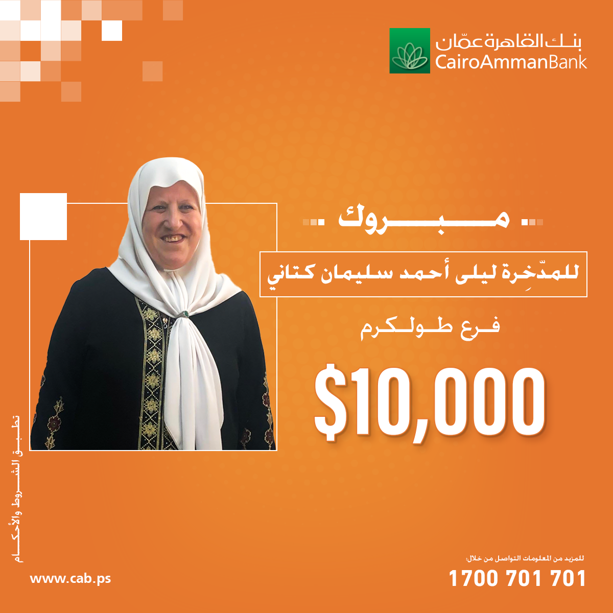 والجائزة لهذا الاسبوع كانت من نصيب السيدة ليلى احمد سليمان كتاني، المدخرة لدى فرع بنك القاهرة عمان في محافظة طولكرم.