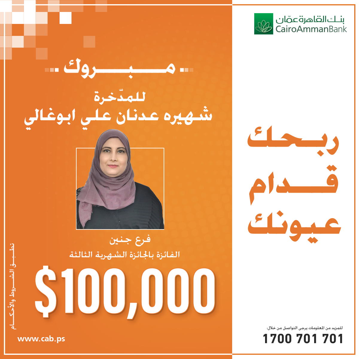 رام الله - الاقتصادي - أعلن بنك القاهرة عمان، عن فوز السيدة شهيرة عدنان علي ابوغالي المدخرة لدى فرع جنين، بالجائزة الكبرى الثالثة البالغة قيمتها 100 ألف دولار امريكي، في حملة حسابات التوفير "ربحك قدام عيونك" للعام 2021.