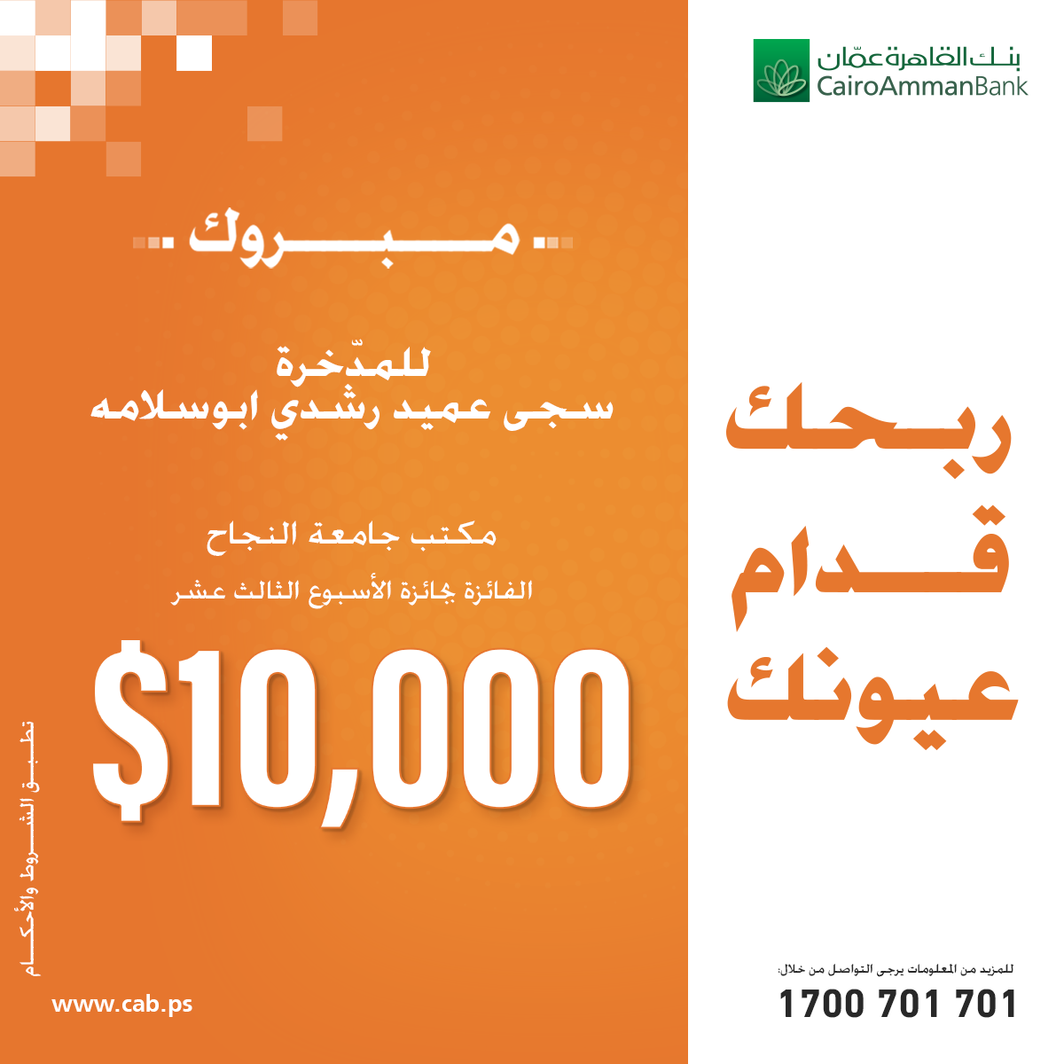 وفازت بالسحب الاسبوعي الثالث عشر، الطالبة سجى عميد رشيد ابو سلامة والمدخرة لدى مكتب بنك القاهرة عمان المتواجد بجامعة النجاح الوطنية بنابلس، كما أعلن البنك عن الفائزة بالأسبوع الثاني عشر، والتي كانت من نصيب السيدة مريم خليل احميدات، المدخرة لدى فرع واد التفاح في الخليل.