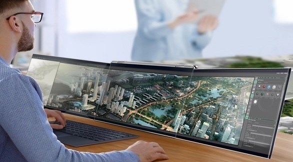 ولا تحتوي شاشة الكمبيوتر المحمول الرئيسية على أي حواف، كما أن شاشات العرض الثانوية لا تحتوي أيضًا على أي حواف بصرية، وهذا يعني أنه عند تكوين الشاشات المتعددة المتصلة، يبدو الإعداد بالكامل وكأنه شاشة واحدة كبيرة. وعند الانتهاء من العمل اليومي، يمكن حمل الأداة المكونة من ثلاث قطع بسهولة في حقيبة تشبه الأوراق التي تُظهر بوضوح الطبيعة المدمجة للتصميم.
