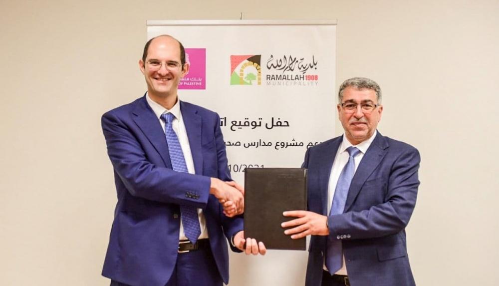 وتنص الاتفاقية على التزام بنك فلسطين بالمساهمة في دعم الأنشطة والفعاليات المختلفة، التي تنفذها بلدية رام الله، ضمن برنامج مدارس صحية وصديقة للبيئة، لا سيما في مجال التوعية الصحية، وذلك من أجل المساهمة في نشر الوعي البيئي لدى طلبة المدارس، والوصول إلى مدينة عصرية منظمة، ومتطورة اقتصادياً وبيئياً.