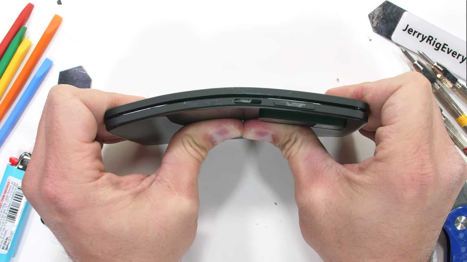 ومن الاختبارات الصعبة التي تعرض لها الهاتف أيضا أثناء تصوير الفيديو هو اختبار متانة الهيكل، فبعد أن حاول الخبير ثني هيكل الجهاز بقوة بكلتا يديه حافظ الجهاز على شكله تقريبا ولم يتعرض لتشوه يذكر.