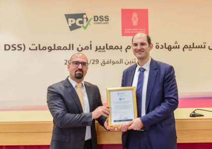 وتسلم السيد محمود الشوا مدير عام بنك فلسطين شهادة (PCI DSS)، خلال الحفل الذي جرى تنظيمه في المركز الرئيسي للإدارة العامة للبنك في رام الله، حيث قام بتسليمها السيد ربيع بركات المدقق المعتمد من مجلس حماية وأمن بطاقات الدفع العالمي، وذلك بحضور عدد من المدراء وممثلين عن الدوائر والأقسام في البنك.
