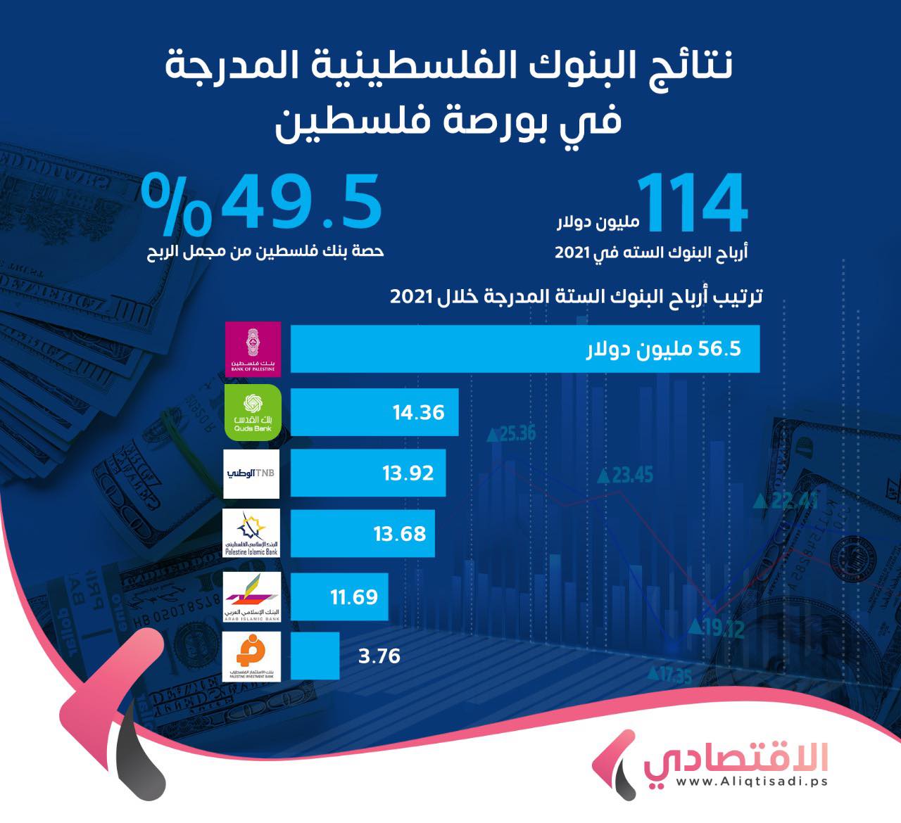 وأظهر مسح أجراه الاقتصادي لبيانات بنك القدس أن صافي ربحه بلغ 14.36 مليون دولار؛ مسجلا صعودا بقيمة 32%، وكان البنك الوطني قد أعلن عن تحقيق صافي أرباح بلغت حوالي 14 مليون دولار، كما حقق بنك الاستثمار الفلسطيني أرباحًا بقيمة 3.76 مليون دولار.