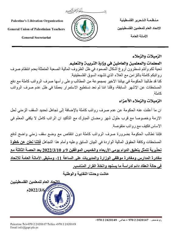 وطالب الاتحاد الحكومة بضرورة صرف الرواتب كاملة دون انتقاص مع وضع سقف زمني واضح لدفع المستحقات وكافة الحقوق المالية للمعلمين.