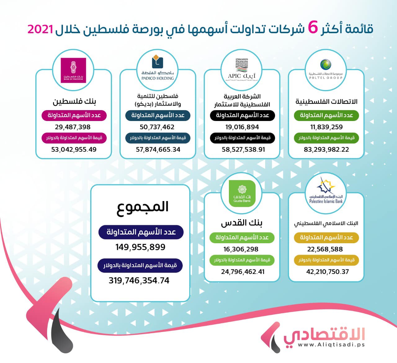 وتالياً أكثر 6 شركات تداولت أسهمها في بورصة فلسطين خلال عام 2021: