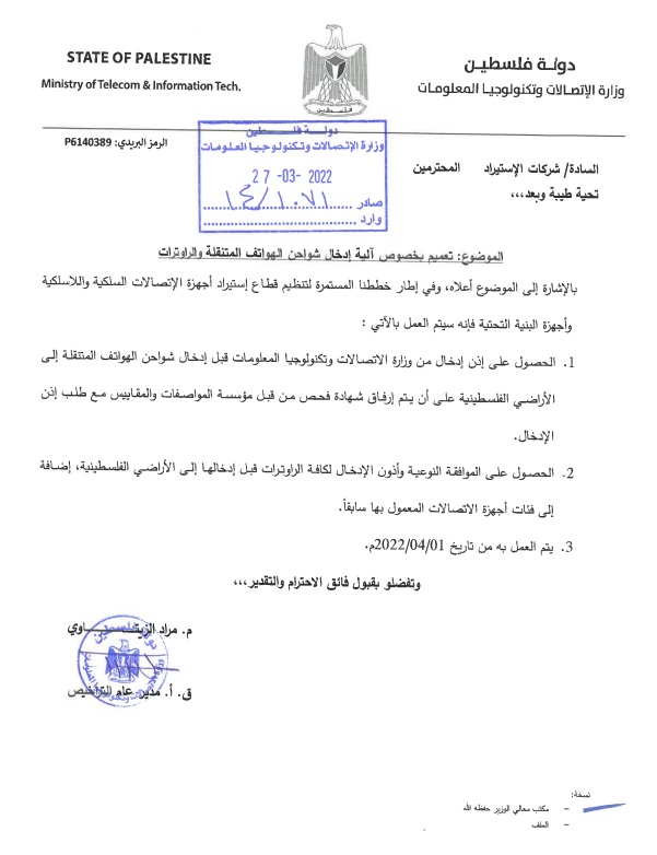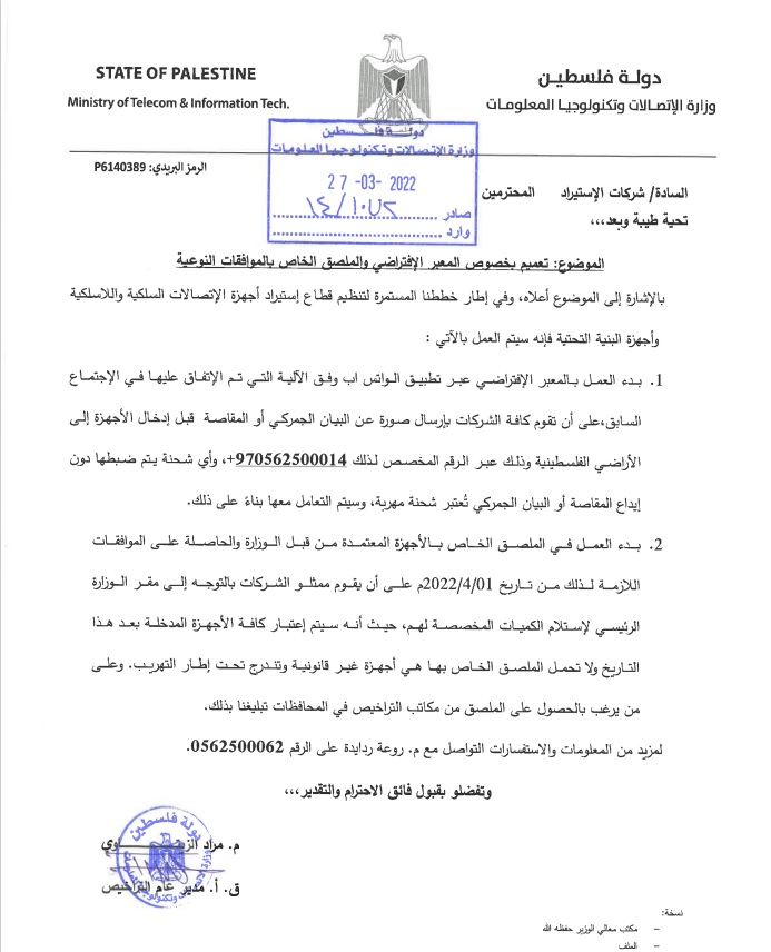 وعممت الوزارة على شركات استيراد الأجهزة الخلوية بوجوب توجه ممثلي الشركات إلى الوزارة لاستلام الكميات الخاصة بها، مع التحذير من معاملة الأجهزة الواردة إلى فلسطين ولا تحمل الملصق الخاص على أنها مهربة.