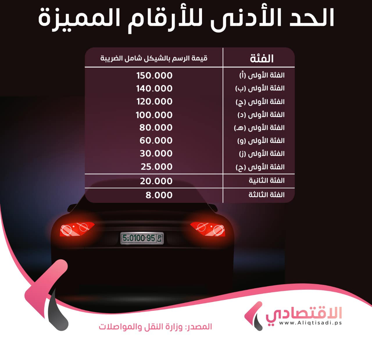 - ثلاثة أرقام من الرقم المتسلسل متطابقة ومتتابعة وغير متطابقة مع رقم الترميز مثل ( 3-1118- A) او وجود زوجين متطابقين متتابعين من الرقم المتسلسل ومتطابقين مع رقم الترميز مثل ( 2- 2233- A) او وجود زوجين متطابقين متتابعين من الرقم المتسلسل وغير متطابقة مع الترميز مثل 1-2233- A) فأن الحد الأدنى لهذه اللوحة 20 ألف شيكل.