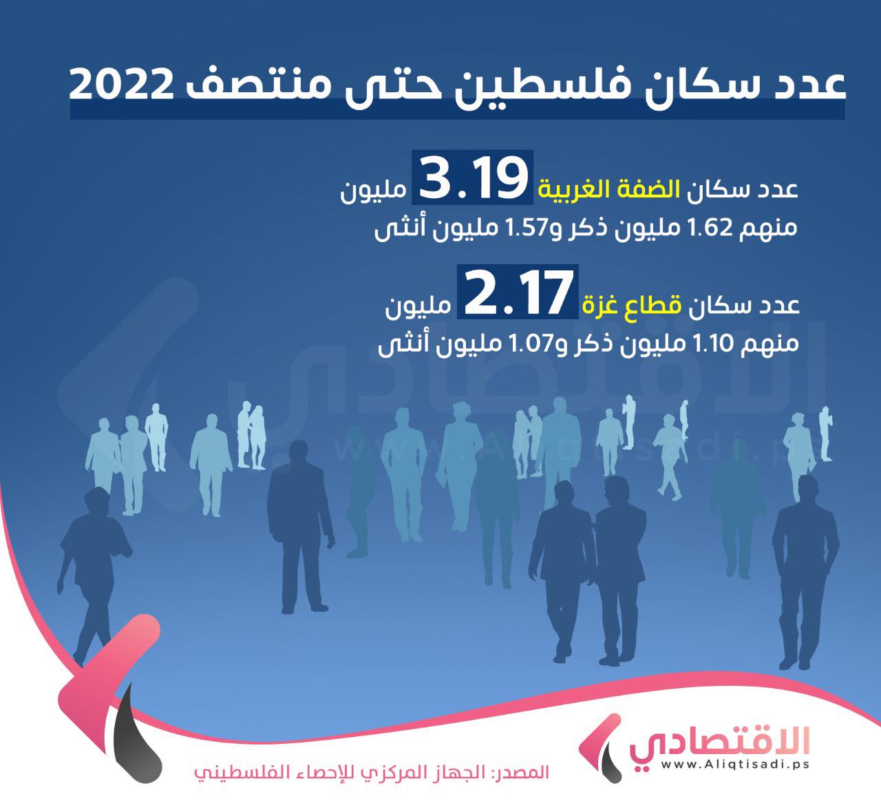الاقتصادي- بناء على التقديرات السكانية التي أعدها الجهاز المركزي للإحصاء الفلسطيني، هناك حوالي 14.3 مليون فلسطيني في العالم منتصف عام 2022 منهم نحو 5.35 مليون فلسطيني في دولة فلسطين، 2.72 مليون ذكر و2.63 مليون أنثى.