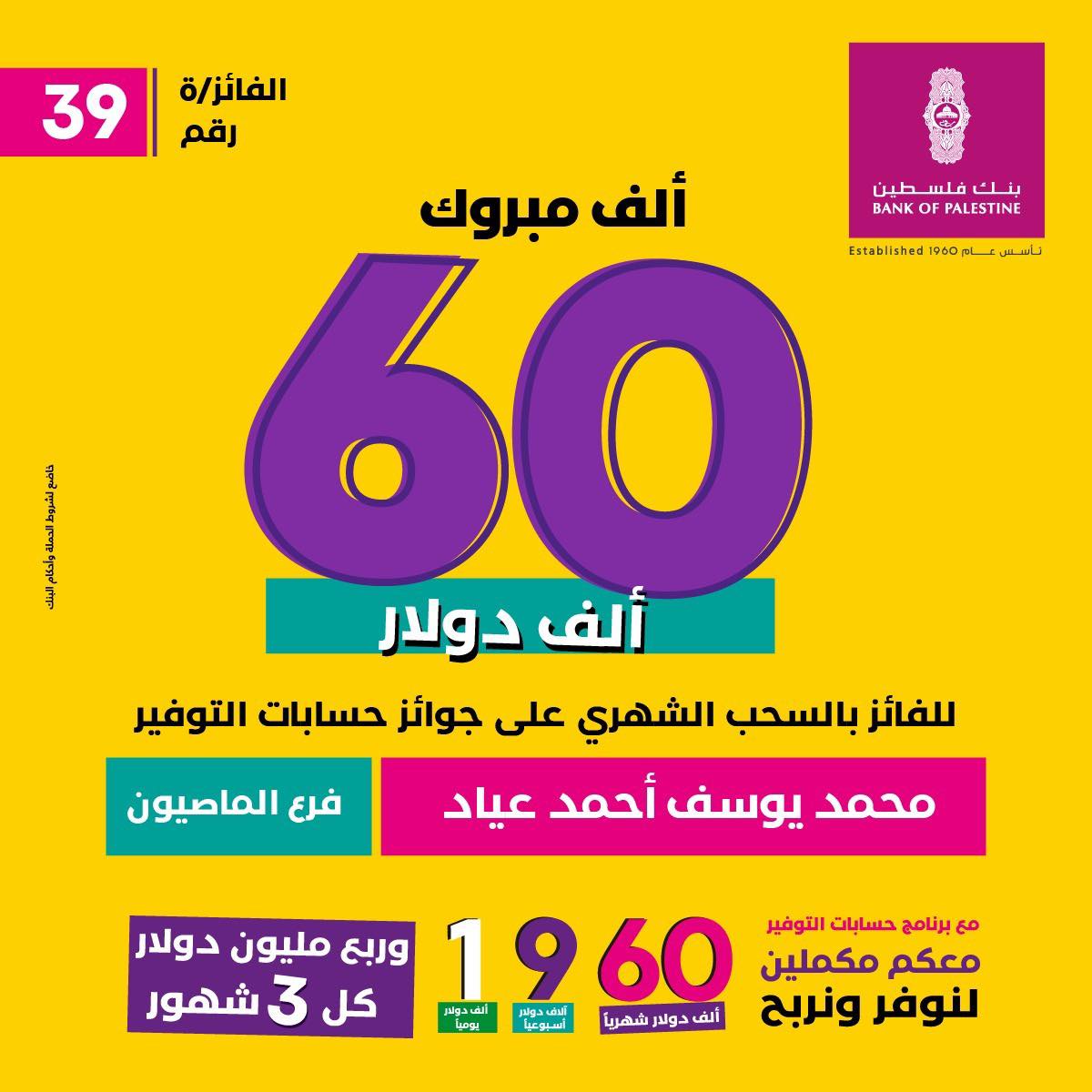 الاقتصادي-أعلن بنك فلسطين عن الفائز بجائزة حسابات التوفير الشهرية، البالغ قيمتها 60 ألف دولار أمريكي، التي فاز بها السيد محمد يوسف أحمد عياد من فرع بنك فلسطين في المصيون بمدينة رام الله، وذلك ضمن حملته التي أطلقها البنك على برنامج حسابات التوفير في كافة فروعه المنتشرة بمختلف محافظات الوطن تحت شعار "معكم مكملين لنوفر ونربح 1960".