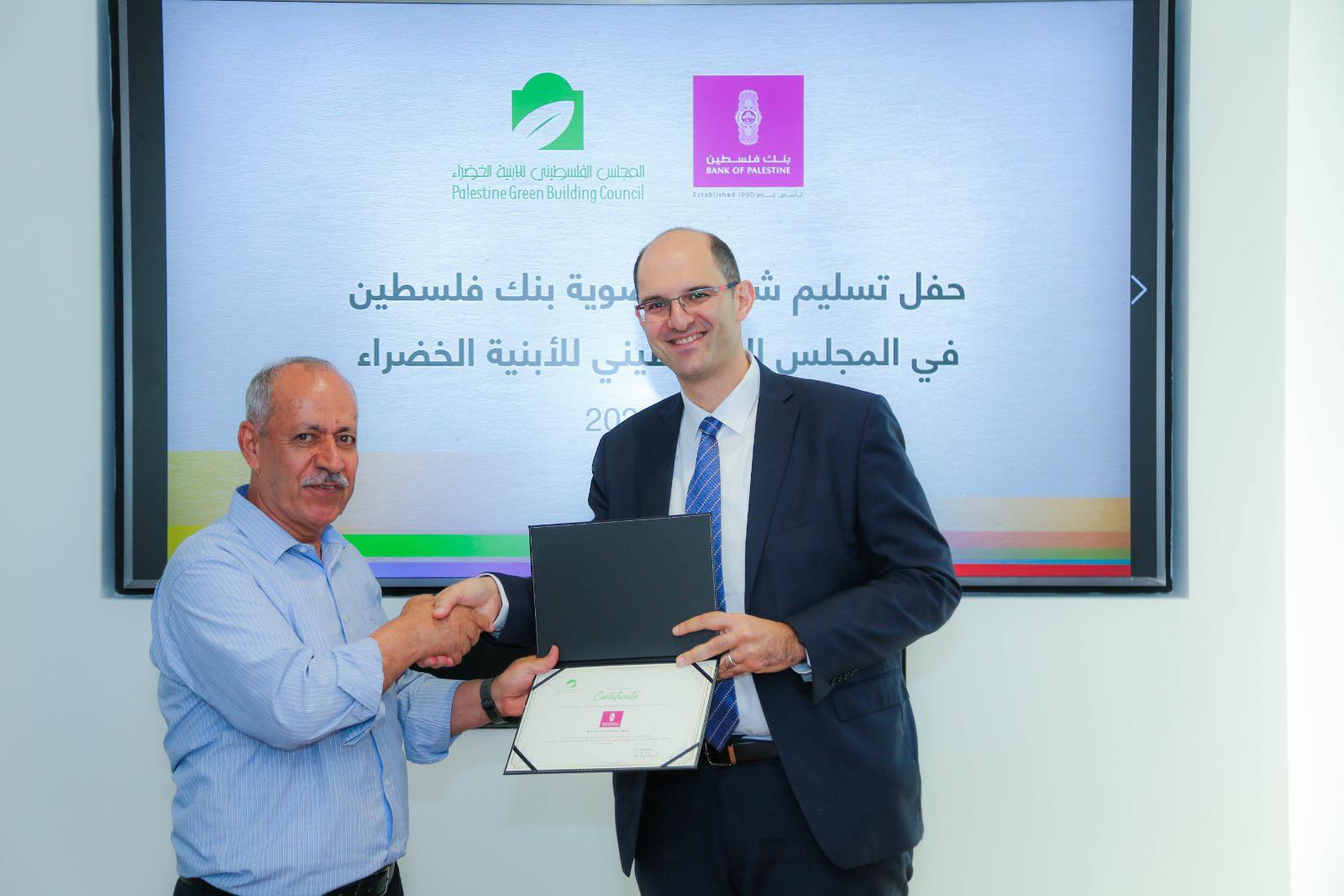 وتسلم مدير عام بنك فلسطين السيد محمود الشوا شهادة العضوية من المجلس الفلسطيني للأبنية الخضراء، خلال حفل خاص أقيم في مقر الإدارة العامة للبنك برام الله، حيث قام بتسليمها رئيس مجلس إدارة المجلس الفلسطيني للأبنية الخضراء د. عفيف عقل، وبحضور عدد من المدراء والمسؤولين من كلا الطرفين.
