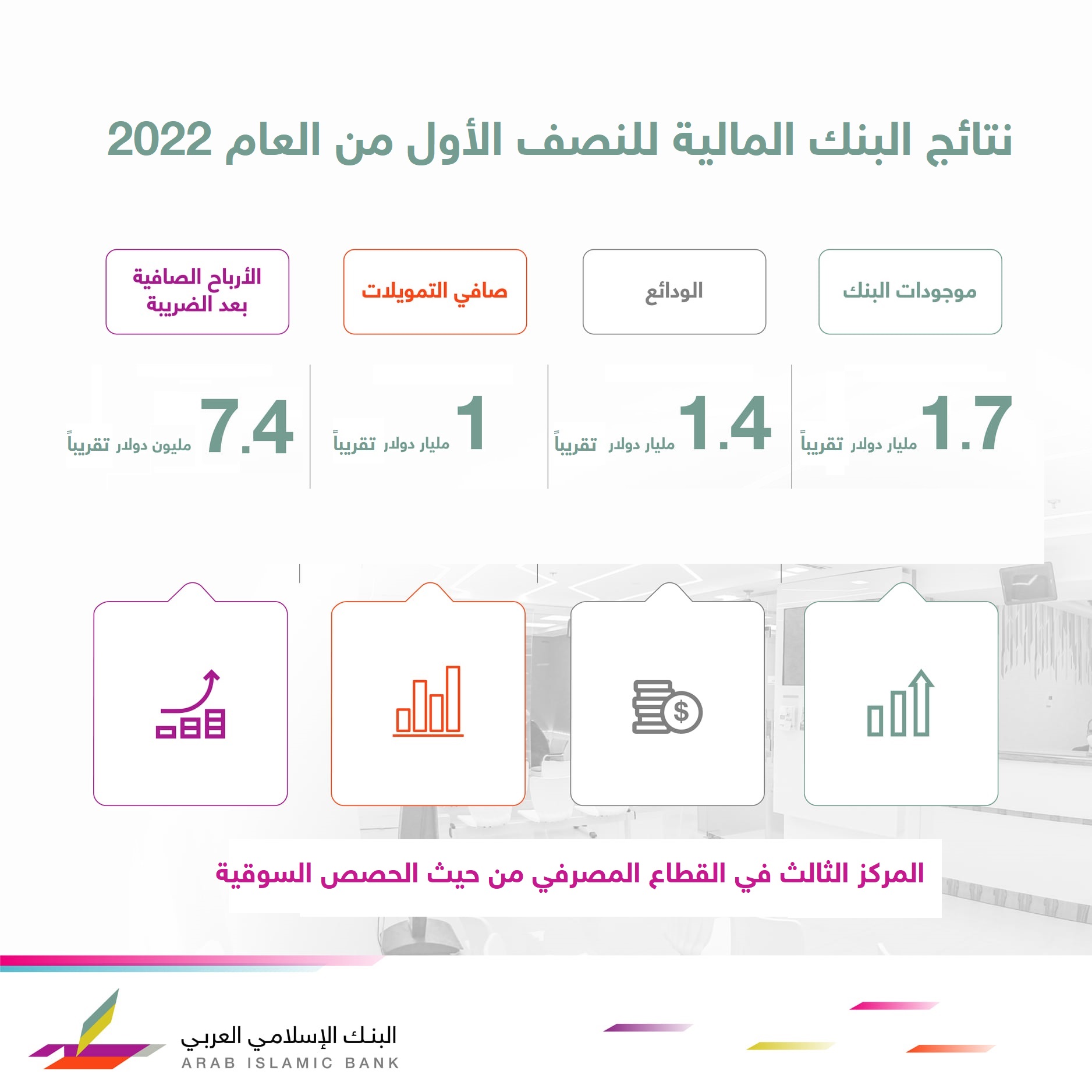 الاقتصادي-حقق البنك الإسلامي العربي أرباحاً صافية بعد الضريبة بلغت قيمتها 7,359,024 مليون دولار للنصف الأول من العام 2022، مقارنة بأرباح بلغت 6,110,435 مليون دولار لنفس الفترة من العام الماضي، محققاً بذلك نمواً بنسبة 20.4%، ويعود ذلك بشكل رئيسي للنمو الملحوظ في إيرادات البنك التشغيلية.
