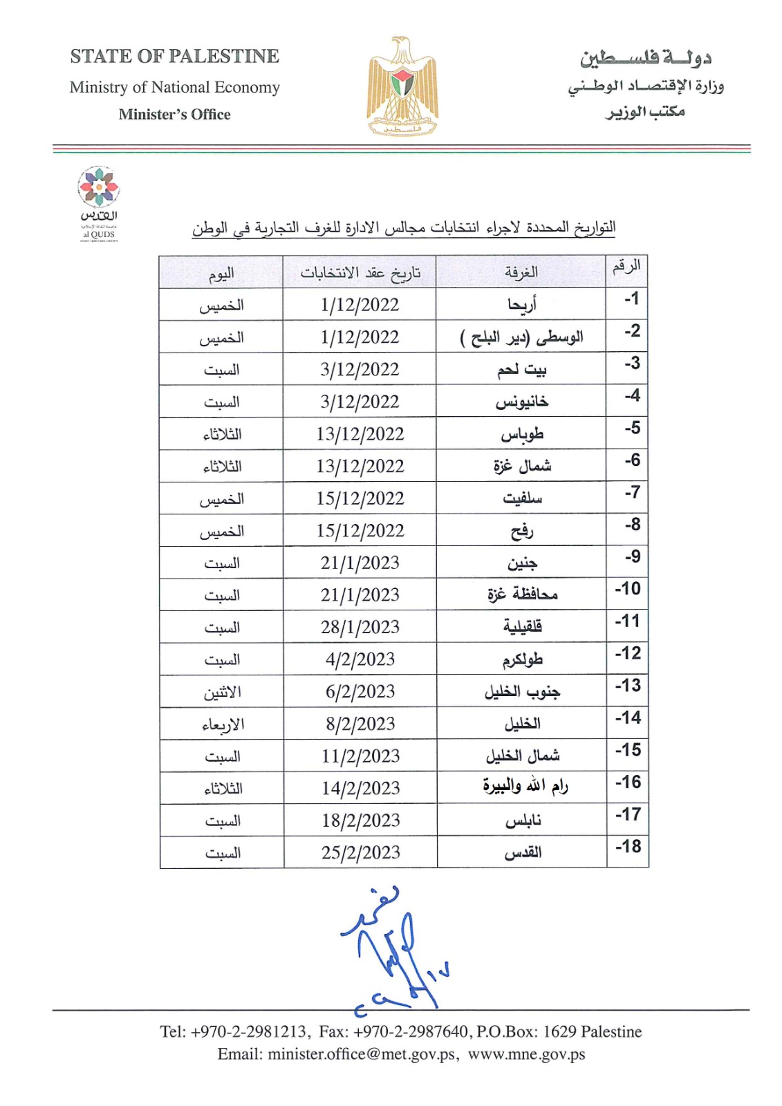 وأكد الوزير على شروع الوزارة في اعداد التحضيرات والاستعدادات اللازمة لإنجاح عقد الانتخابات بالتنسيق مع اتحاد الغرف التجارية، لافتا الى أن الانتخابات ستجرى بالتزامن بين شطري الوطن وبما يشمل القدس وفق جدول زمني يشمل عقد الانتخابات فيها بالتتابع .