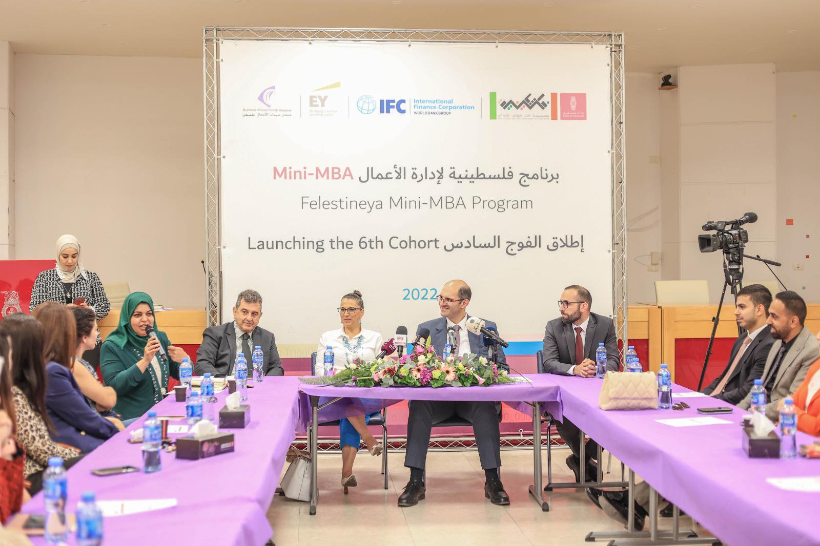 الاقتصادي- أطلق بنك فلسطين برنامج فلسطينية لإدارة الأعمال Mini-MBA في فوجه السادس، بالتعاون مع مؤسسة التمويل الدولية IFC ومنتدى سيدات الأعمال وشركة إيرنست اند يونغ، بحضور مدير عام بنك فلسطين السيد محمود الشوا، وشركاء البرنامج ومشاركة 40 سيدة من صاحبات الأعمال من مختلف محافظات الوطن وخريجات أفواج سابقة، وذلك من خلال تقنية الاتصال المرئي – فيديو كونفرنس التي جمعت الحضور في رام الله وغزة.
