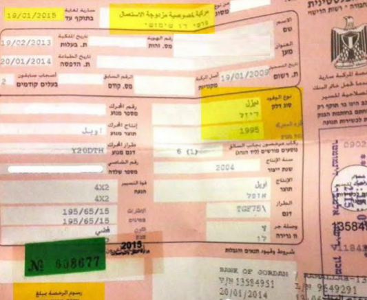 ويدفع صاحب كل مركبة رسوم ترخيص سنوية بمعدل 650 شيكل للمركبات التي يقل محركها عن (2000 سي سي)، و1200 شيكل عن المحركات الأعلى من ذلك.