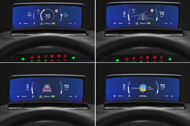 هذه الخاصية التي تعرف في الإنجليزية بـ “HUD | Head up display”، عبارة عن نظام إلكتروني يحاكي شاشة التحكم أو لوحة عدادات السيارة عن طريق عرض بعض المعلومات المهمة على الجزء السفلي من الزجاج الأمامي أو على شاشة خاصة/ مرآة مقعرة خلف عجلة القيادة، وتوضع هذه المعلومات بحيث تكون في مرمي أعين ونظر السائق بطريقة واضحة ومقروءة.