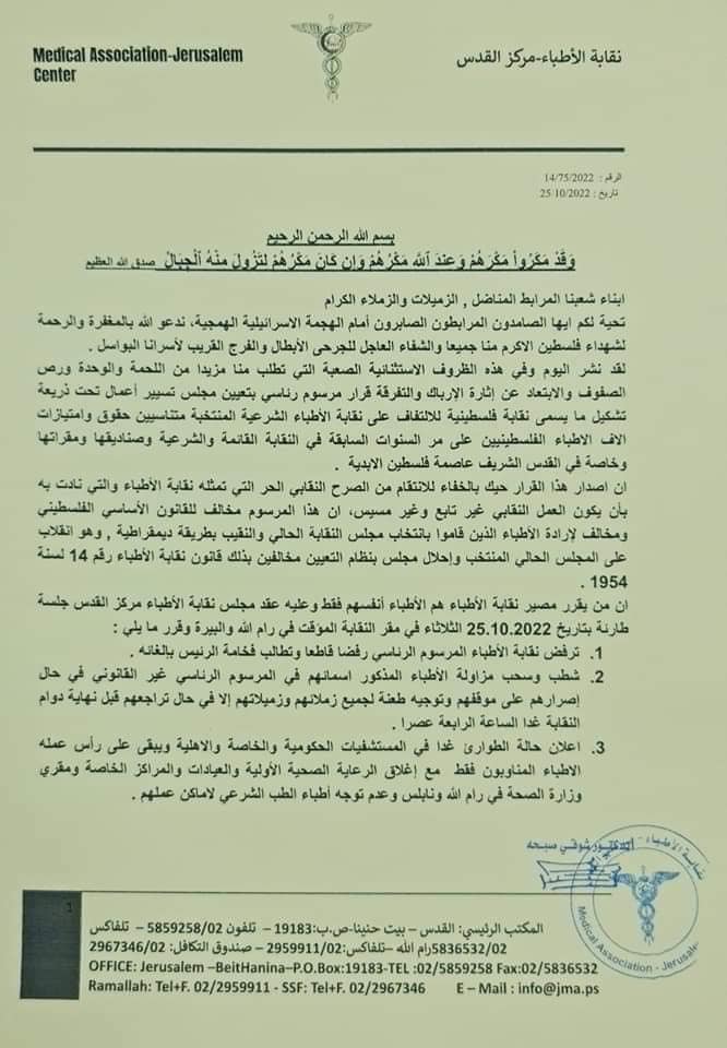 وأصدر الرئيس الثلاثاء، مرسوما بحل نقابة الأطباء الفلسطينيين الحالية وتشكيل نقابة أخرى بديلة "نقابة الأطباء الفلسطينيين".