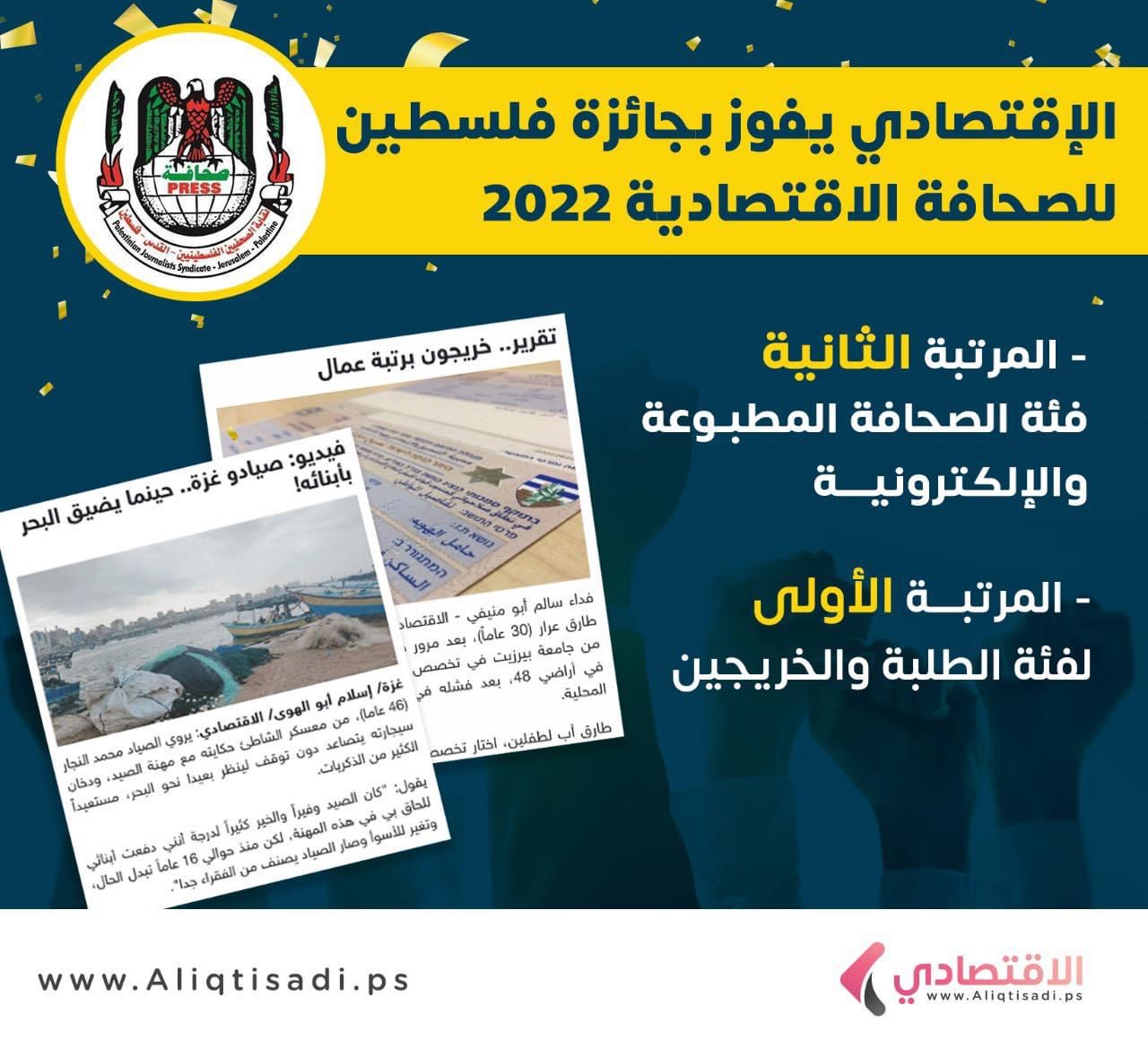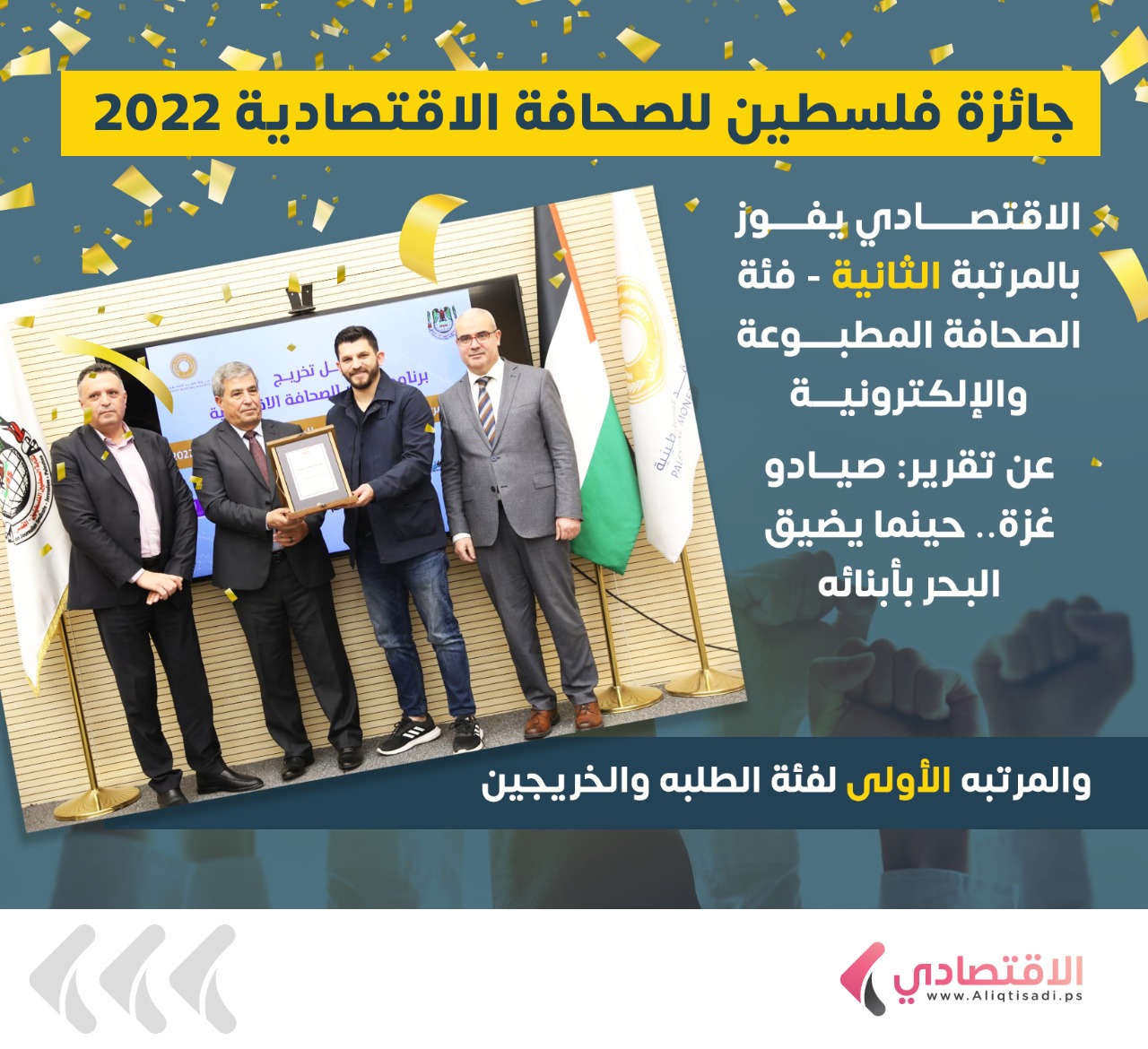 الاقتصادي: حصل تقرير موقع الاقتصادي على المرتبة الثانية في جائزة فلسطين للصحافة الاقتصادية للعام 2022 عن فئة "الصحافة المطبوعة والإلكترونية".