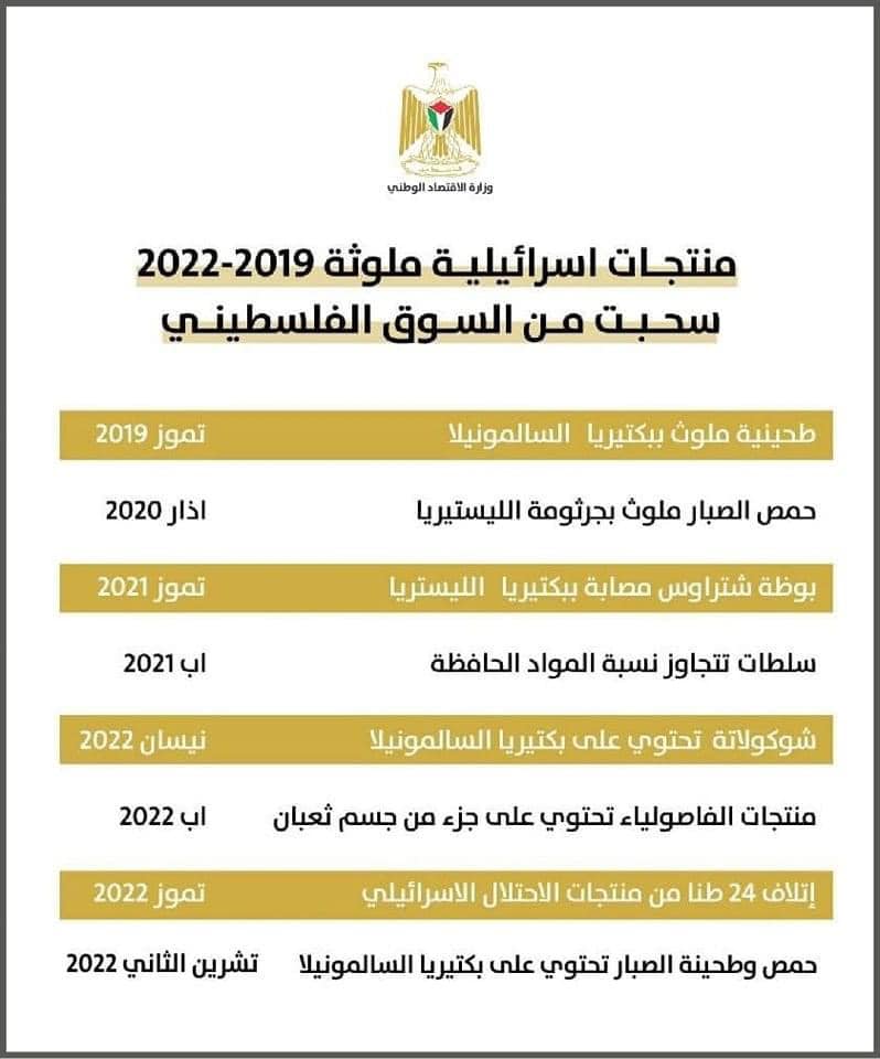 وفي نيسان من العام الجاري، سحبت وزارة الاقتصاد الوطني شوكولاتة تحتوي على بكتيريا السالمونيلا، وفي آب سحبت منتجات الفاصولياء تحتوي على جزء من جسم ثعبان. وفي تموز من العام ذاته، أتلفت 24 طنًا من منتجات الاحتلال. ومؤخرًا في تشرين الثاني الماضي، سحبت وزارة الاقتصاد حمص وطحينة الصبار تحتوي على بكتيريا السالمونيلا.