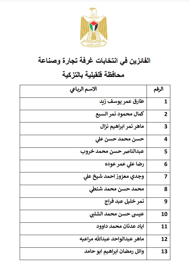 يشار إلى ان انتخابات الغرف التجارية تجري وفق جدول زمني أعلن عنه سابقا من قبل وزير الاقتصاد الوطني لـ18 غرفة تجارية في كافة محافظات الوطن، بما فيها العاصمة المحتلة القدس.