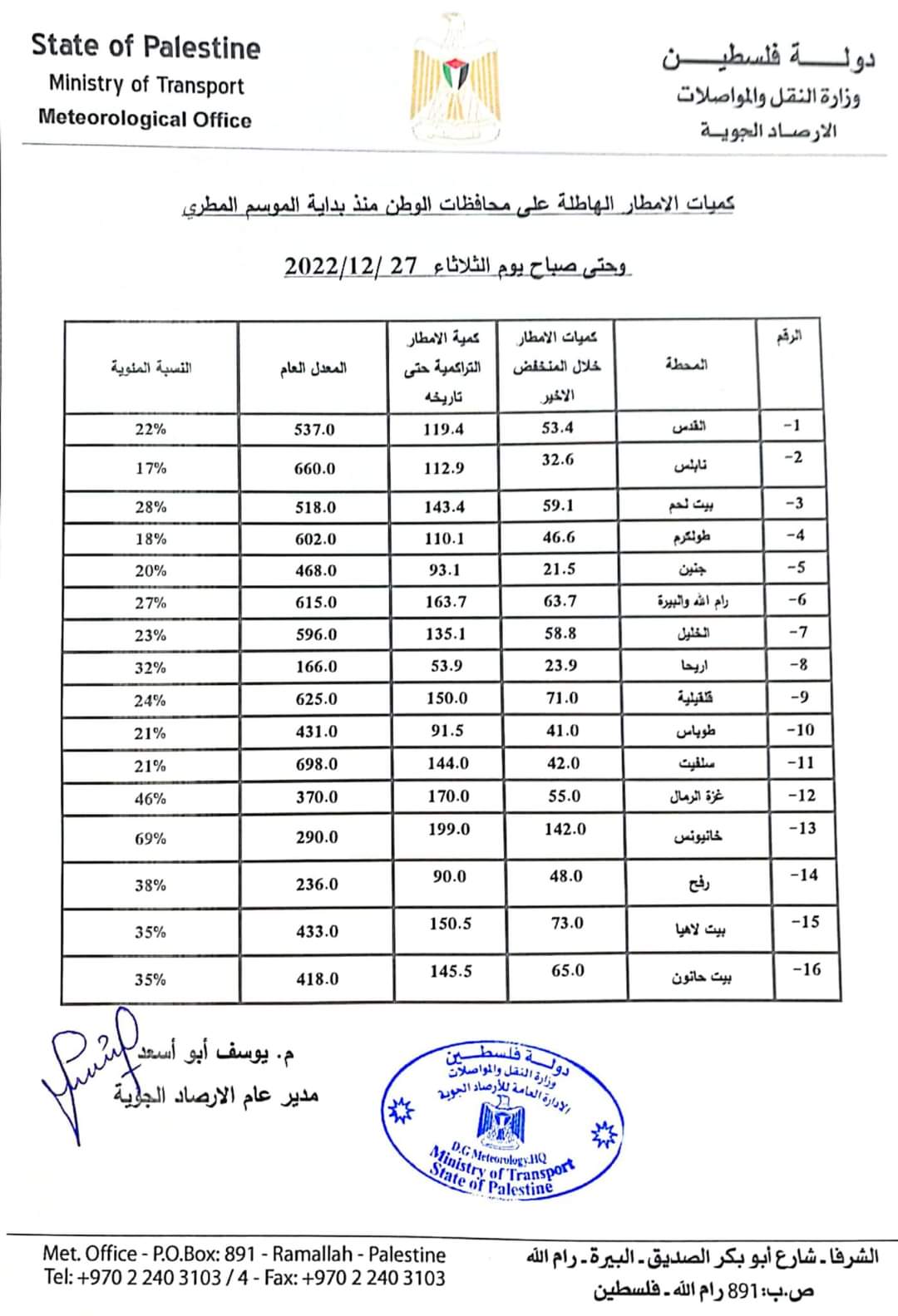 وفي الجدول أدناه كمية الأمطار الهاطلة على كافة مناطق فلسطين منذ بداية الموسم المطري، حسب دائرة الأرصاد الجوية الفلسطينية: