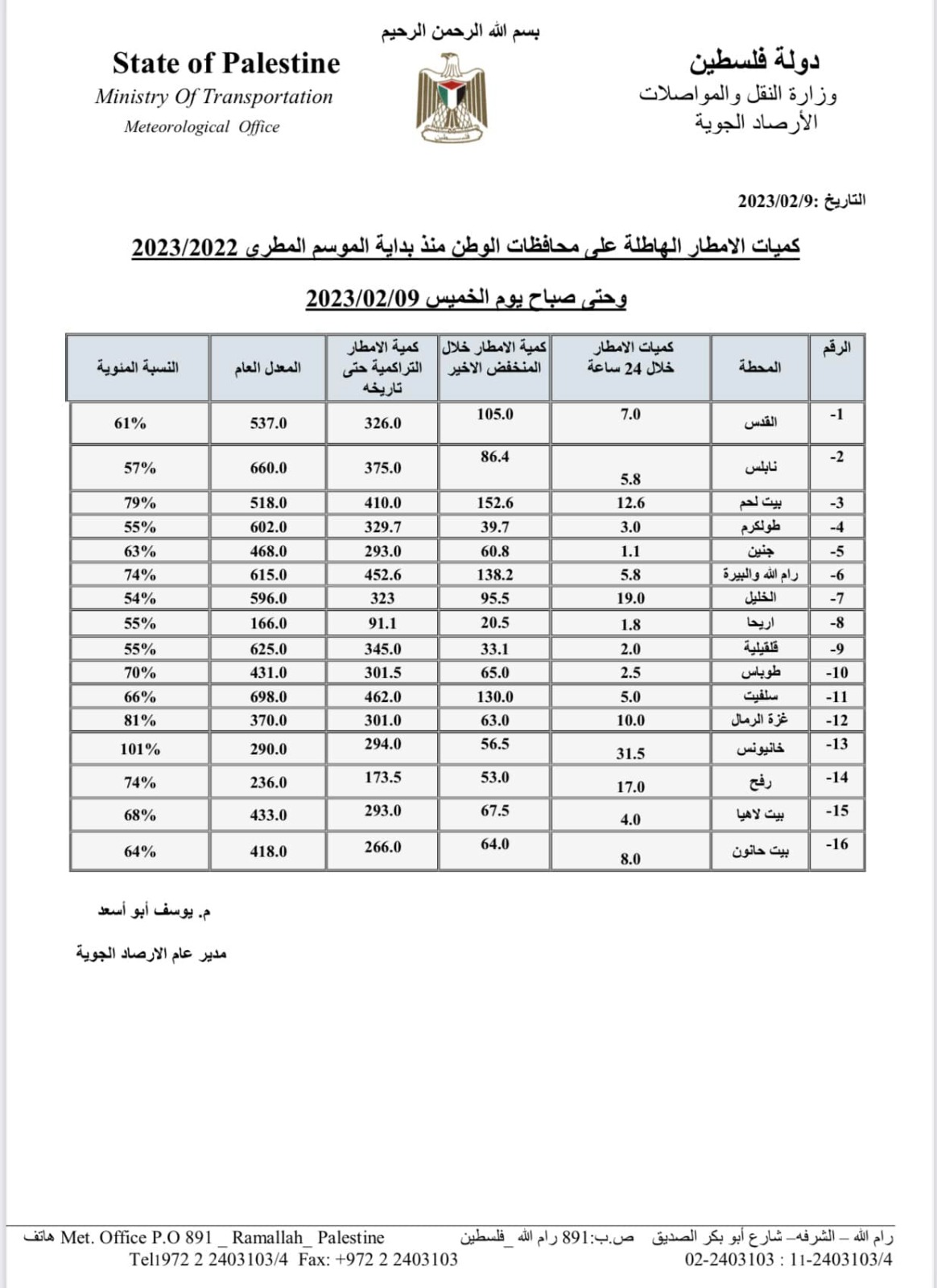 وفي الجدول أدناه كمية الأمطار الهاطلة على كافة مناطق فلسطين منذ بداية الموسم المطري، حسب دائرة الأرصاد الجوية الفلسطينية:
