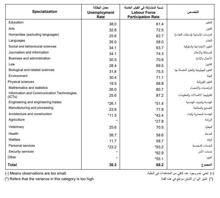 وتصدر تخصص الصحة نسبة البطالة، بـ38.7 %، خلفه مباشرة تخصص التعليم بنسبة 38% ثم تخصص اللغات بنسبة 35% والصحافة والإعلام والعلوم الاجتماعية والسلوكية 34.1%.