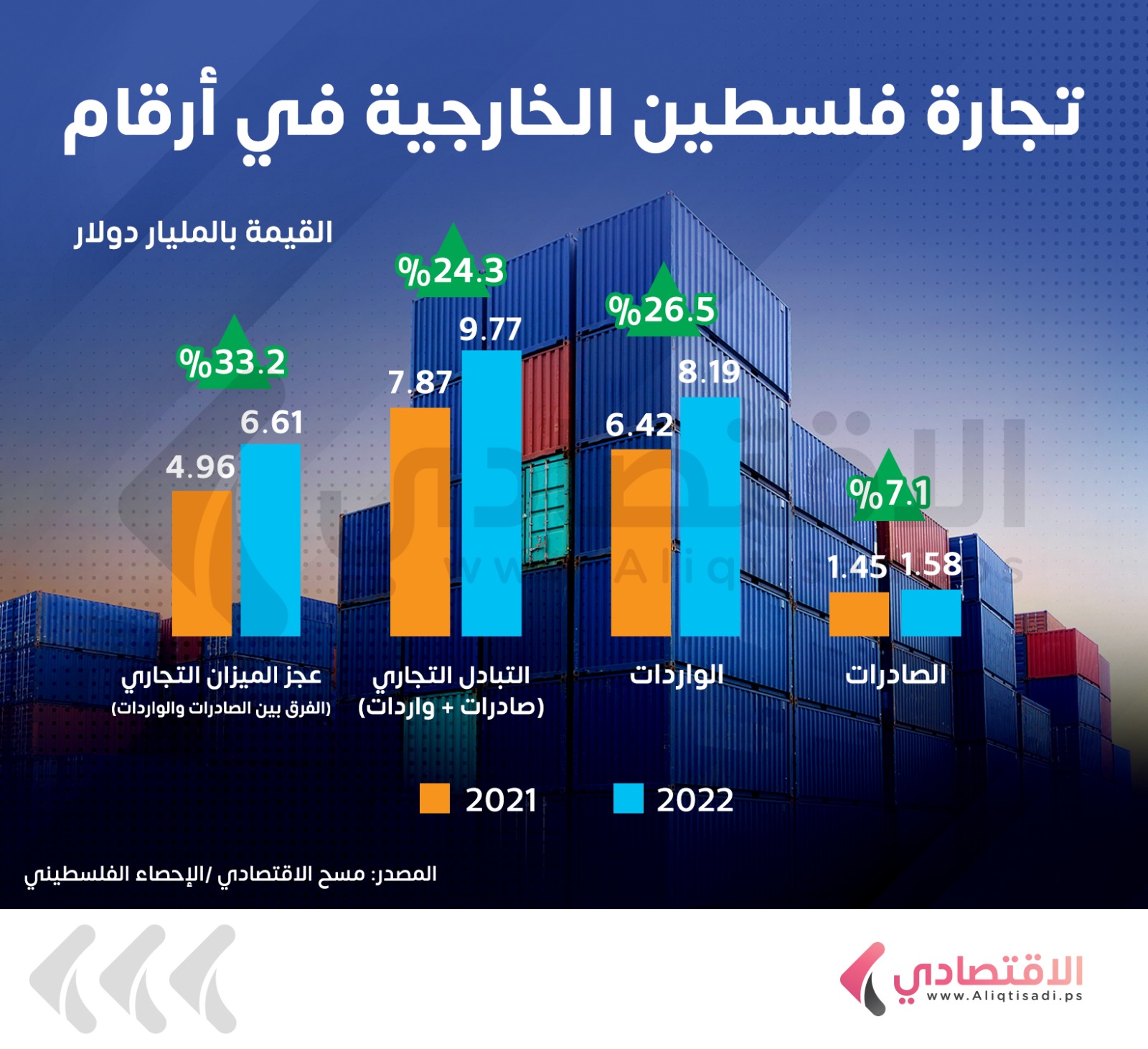 وقفز التبادل التجاري الفلسطيني العام الماضي بنسبة 24.1 % مدفوعا بارتفاع قيمة الصادرات والواردات من 7.87 مليارات دولار إلى 9.78 مليار دولار.