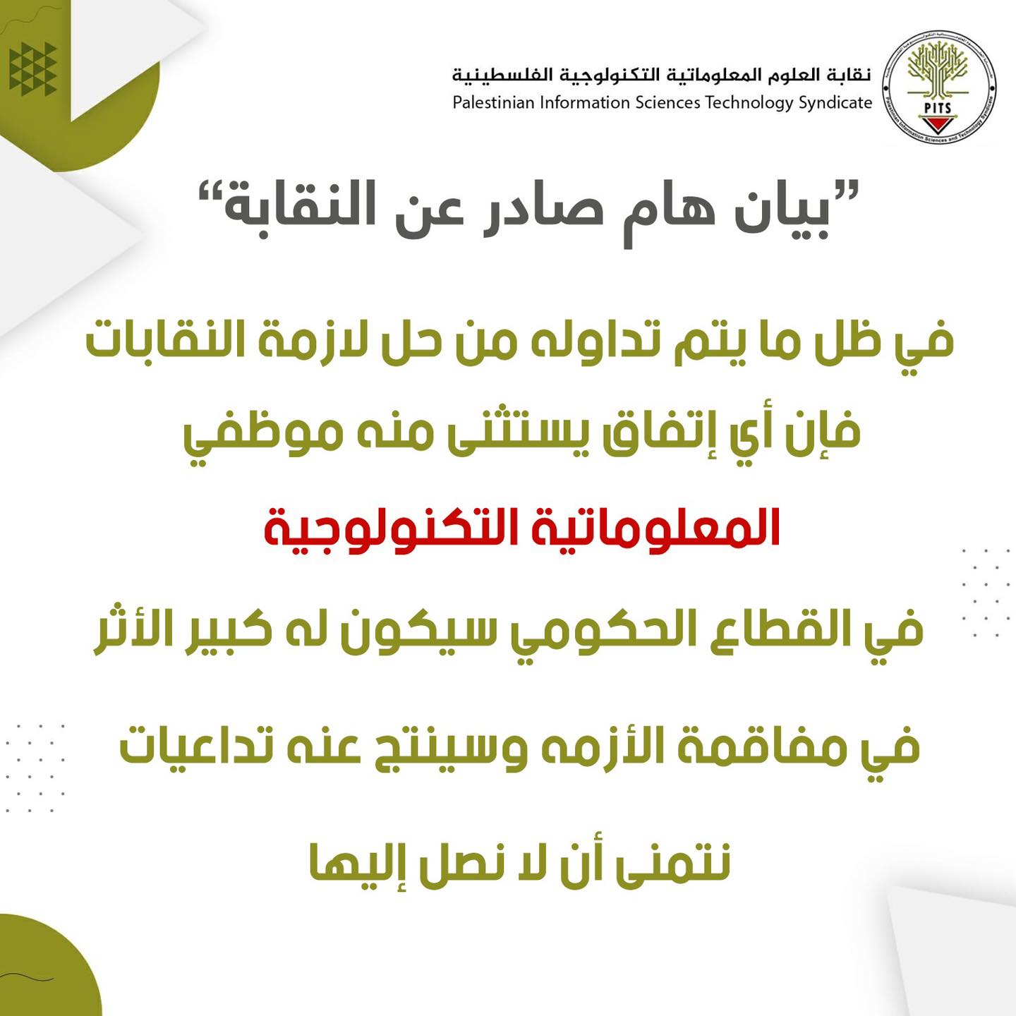 الاقتصادي: حذرت نقابة "العلوم المعلوماتية التكنولوجية الفلسطينية" من أن أي اتفاق يستثنى منه موظفي المعلوماتية التكنولوجية في القطاع الحكومي، سيكون له كبير الأثر في مفاقمة الأزمة وسينتج عنه تداعيات.