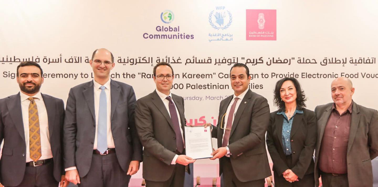 وجرى توقيع الاتفاقية اليوم الخميس الموافق 23/3/2023 في مبنى المركز الرئيسي للإدراة العامة لبنك فلسطين في مدينة رام الله، بحضور هاشم الشوا رئيس مجلس إدارة مجموعة بنك فلسطين، وسامر عبد الجابر ممثلاً عن برنامج الأغذية العالمي (WFP) في فلسطين، ومحمود الشوا المدير العام للبنك، ولنا أبو حجلة مديرة منظمة مجتمعات عالمية، وبمشاركة عدد من مدراء الإدارات العليا والدوائر في البنك وبرنامج الغذاء العالمي ومنظمة مجتمعات عالمية.