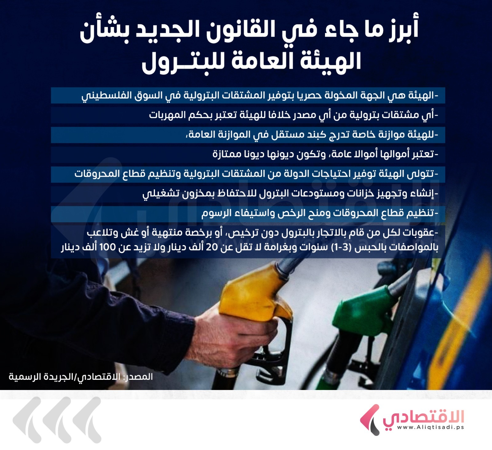وبموجب القرار تتمتع الهيئة بالشخصية الاعتبارية والقانونية وتعتبر الجهة المخولة حصريا بتوفير المشتقات البترولية في السوق الفلسطيني، وأي مشتقات بترولية من أي مصدر خلافا للهيئة تعتبر بحكم المهربات.