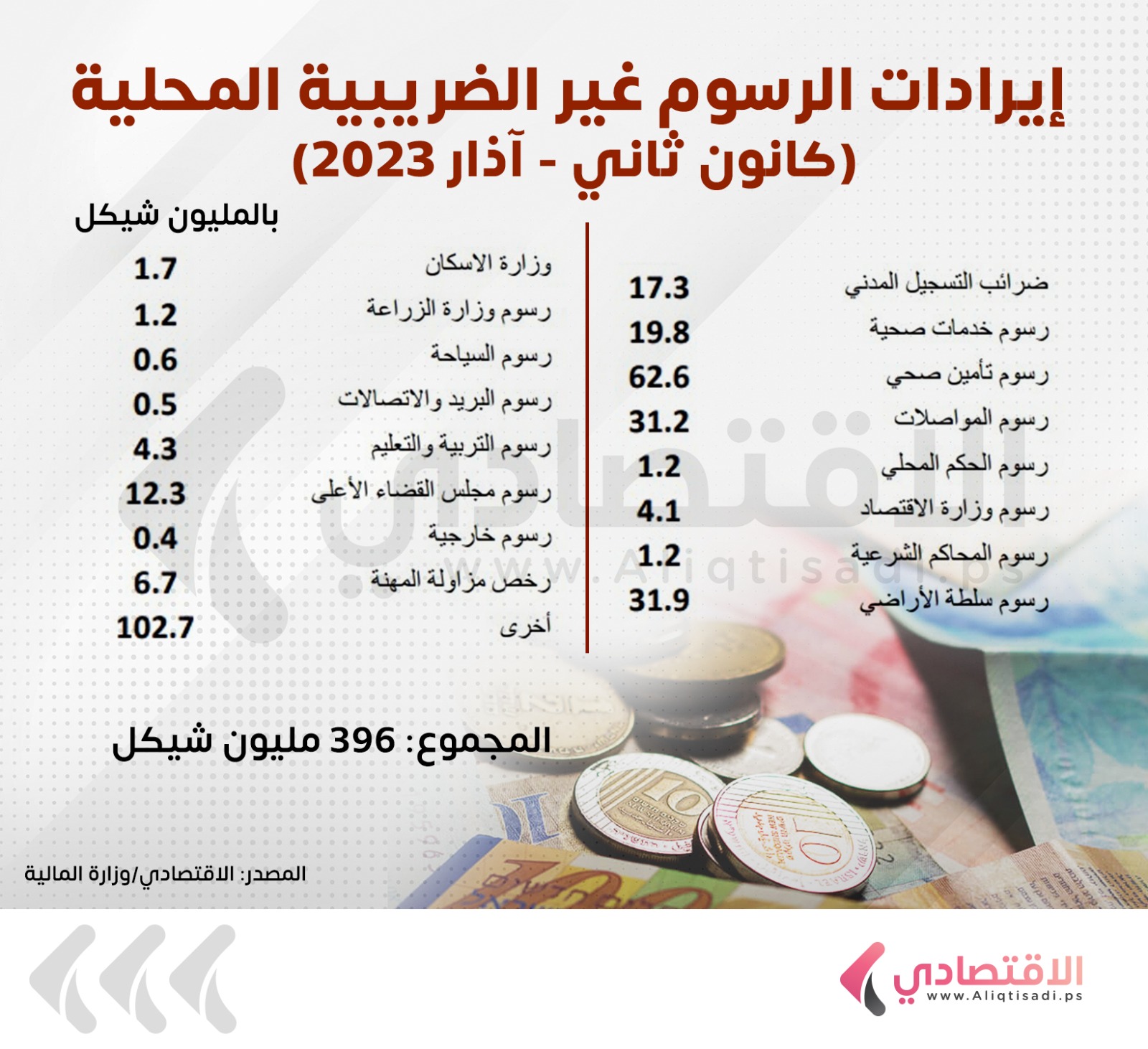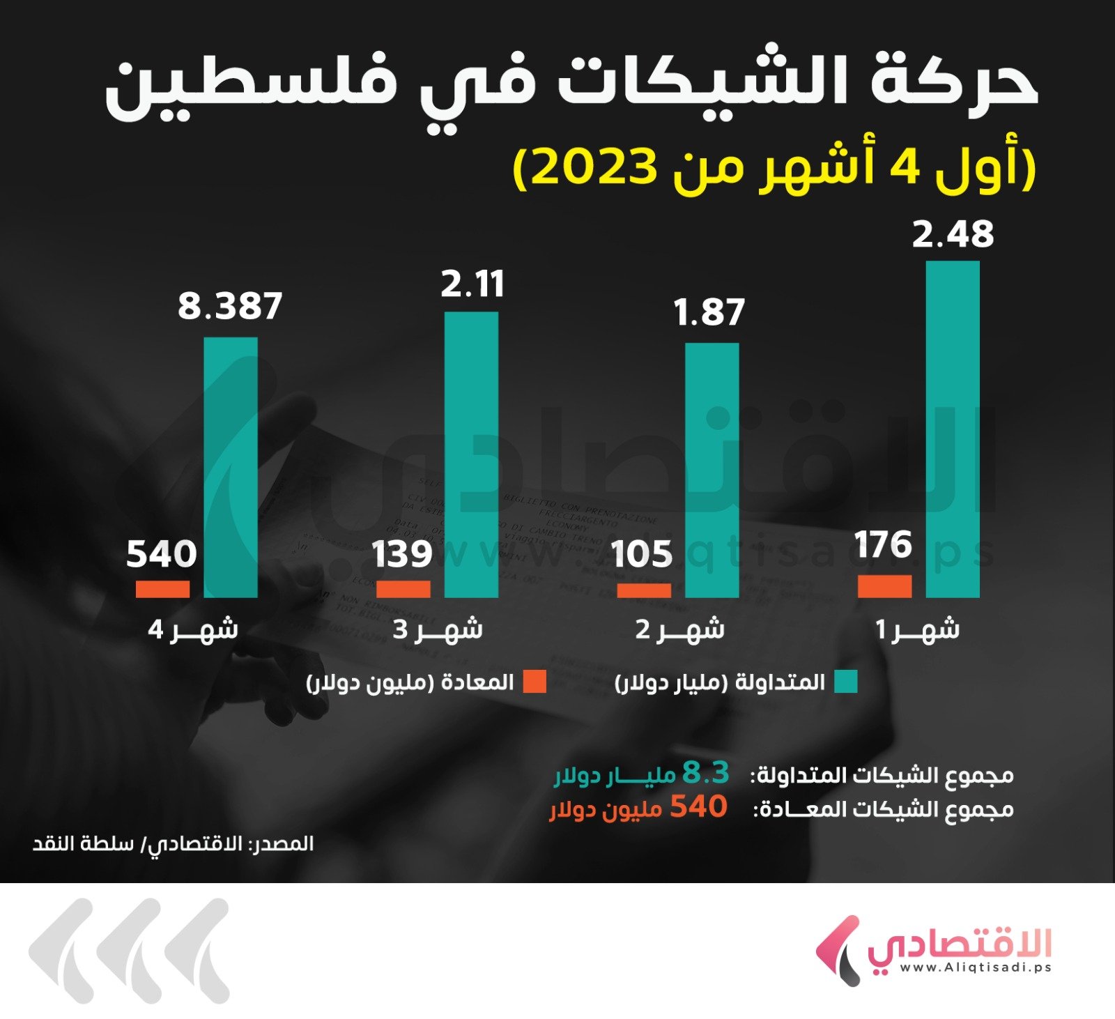 الاقتصادي: بثينة سفاريني- في هذه المادة، نقدم لكم أبرز الأرقام المتعلقة بالمالية العامة ونتائج أعمال البنوك في فلسطين وحركة الشيكات خلال فترة الربع الأول من العام الجاري، استنادا على تقارير نشرها الاقتصادي في الفترة المذكورة.