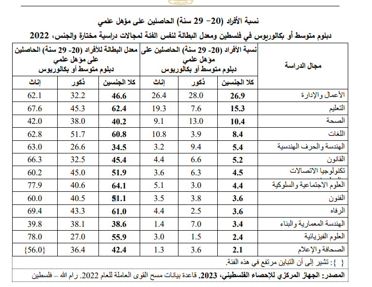 وذكر التقرير، أن أعلى التخصصات بطالة في صفوف الخريجين في فلسطين، تخصص العلوم الاجتماعية، بنسبة بطالة سجلت 64.1 % مع نهاية 2022.