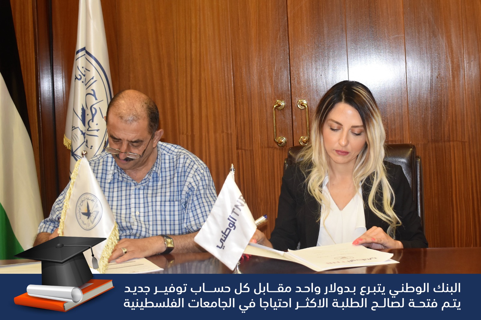 وقع الاتفاقية عن الجامعة، المدير المالي رشيد الكخن، وعن البنك الوطني مديرة العلاقات العامة ريم عناني في حرم الجامعة، بحضور عدد من الإداريين من كلا الطرفين.