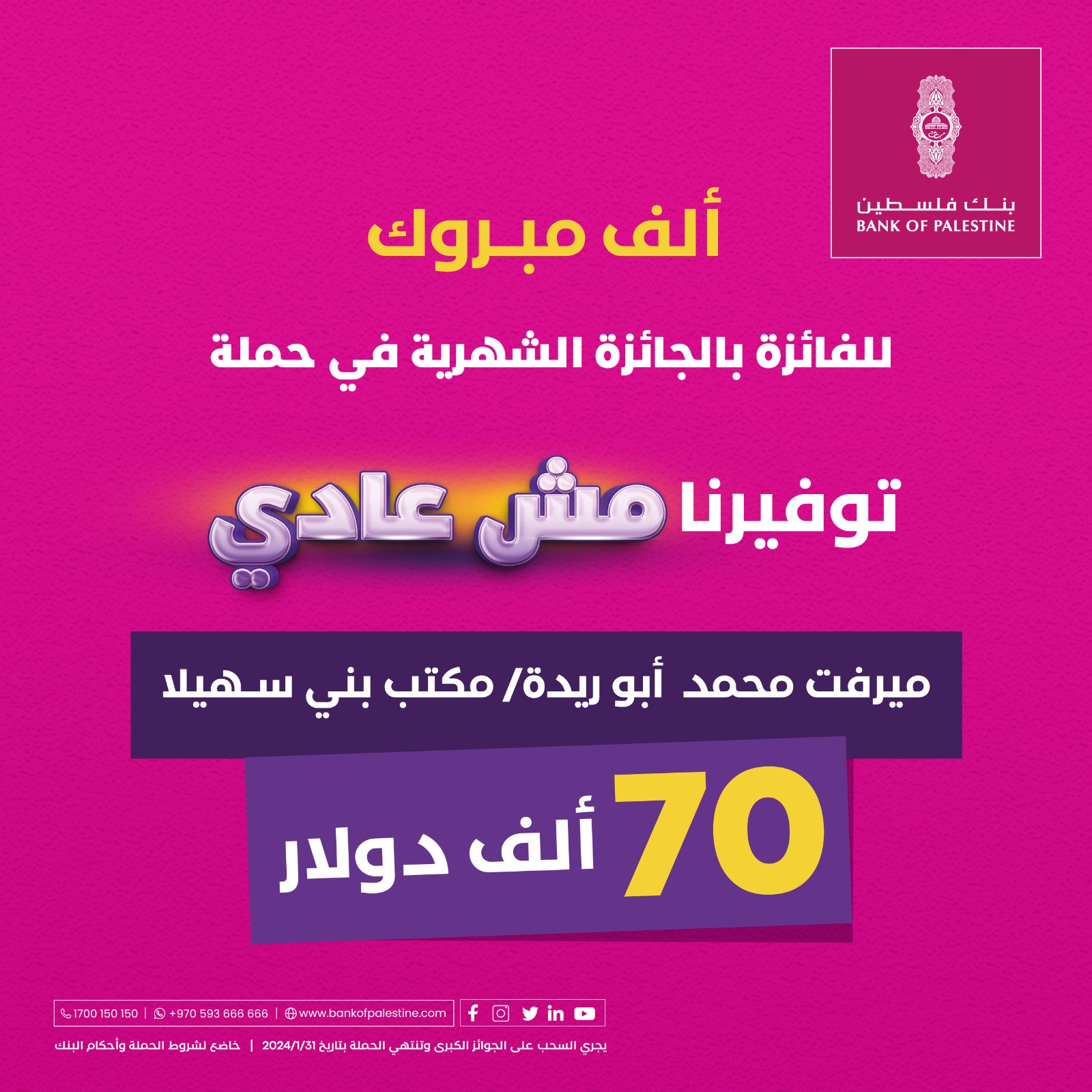 وبهذه المناسبة توجه مدير عام بنك فلسطين محمود الشوا بالتهنئة من السيدة ميرفت محمد رمضان أبو ريدة الفائزة بالجائزة الشهرية، متمنياً لها التوفيق والنجاح في مسيرتها الحياتية والمهنية، معرباً عن سعادته بمواصلة البنك تقديم المزيد من الجوائز ضمن برامج التوفير التي تُعد من أكبر البرامج على مستوى القطاع المصرفي من قيمة الجوائز وعدد الفائزين، بما يتيح لعملاء البنك تحقيق أحلامهم وتطلعاتهم.