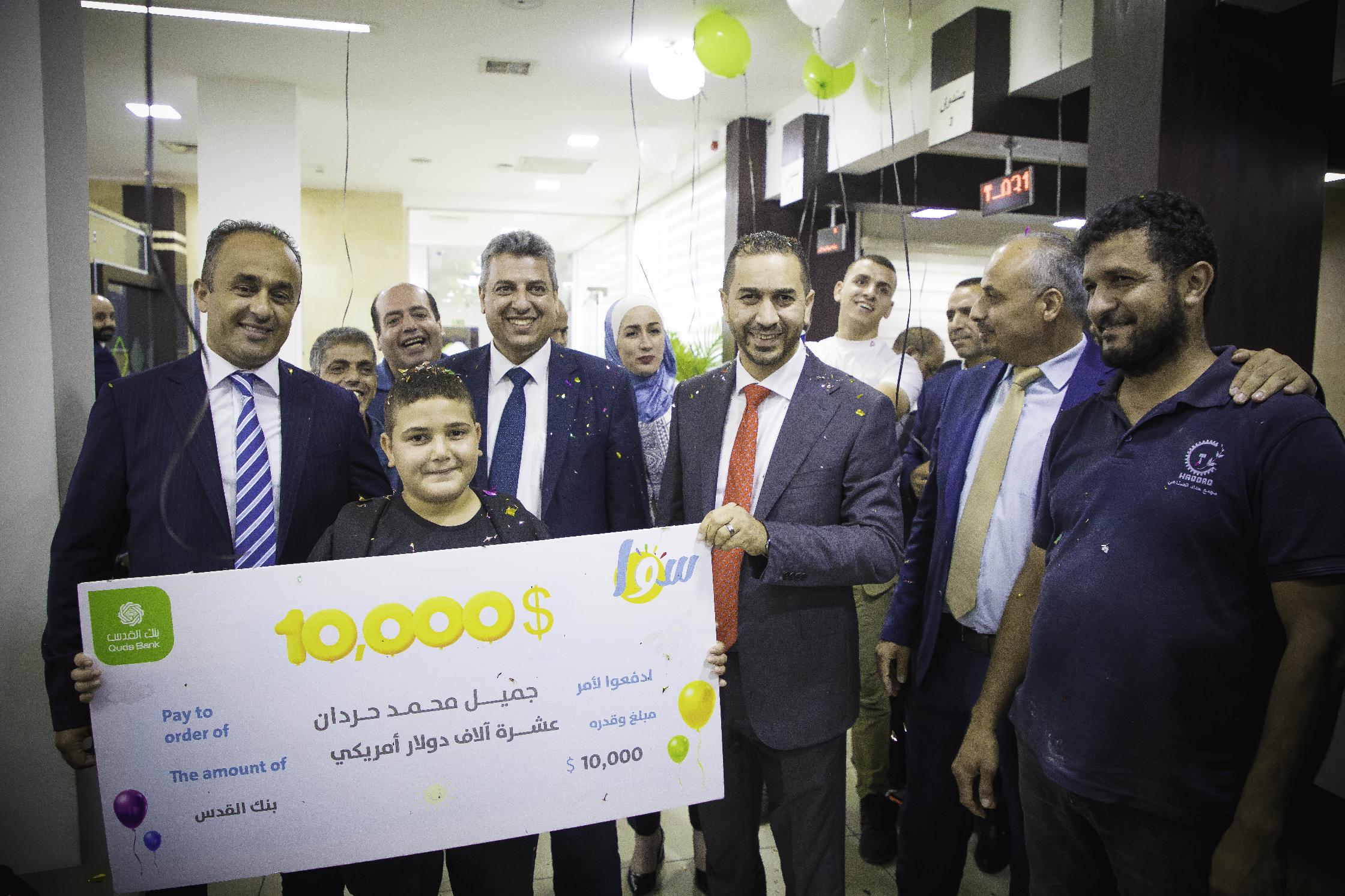 الاقتصادي: فاجأت إدارة بنك القدس الطفل جميل حردان من مدينة جنين في أول يوم دوام له في المدرسة بفوزه بجائزة حساب توفير برنامج سوا، حيث تم تبليغ والد الطفل الفائز مسبقاً أن الجائزة هي عبارة عن جهاز لاب توب وعليه الحضور إلى الفرع، وقامت إدارة البنك بالتنسيق لإحضار الطفل من المدرسة وإحضار والده من مكان عمله لاستلام الجائزة من الفرع، وفي أجواء احتفالية بحضور القائم بأعمال الرئيس التنفيذي لبنك القدس محمد شاور ورئيس إدارة الخدمات المصرفية للأفراد سامح عبد الله في البنك، الذي فاجأ الطفل ووالده وأمام كل من كان في الفرع، أن الجائزة قيمتها عشرة آلاف دولار أمريكيK وليس كما تم تبلغيهم مسبقا ليعم الفرح والسرور على الطفل ووالده.