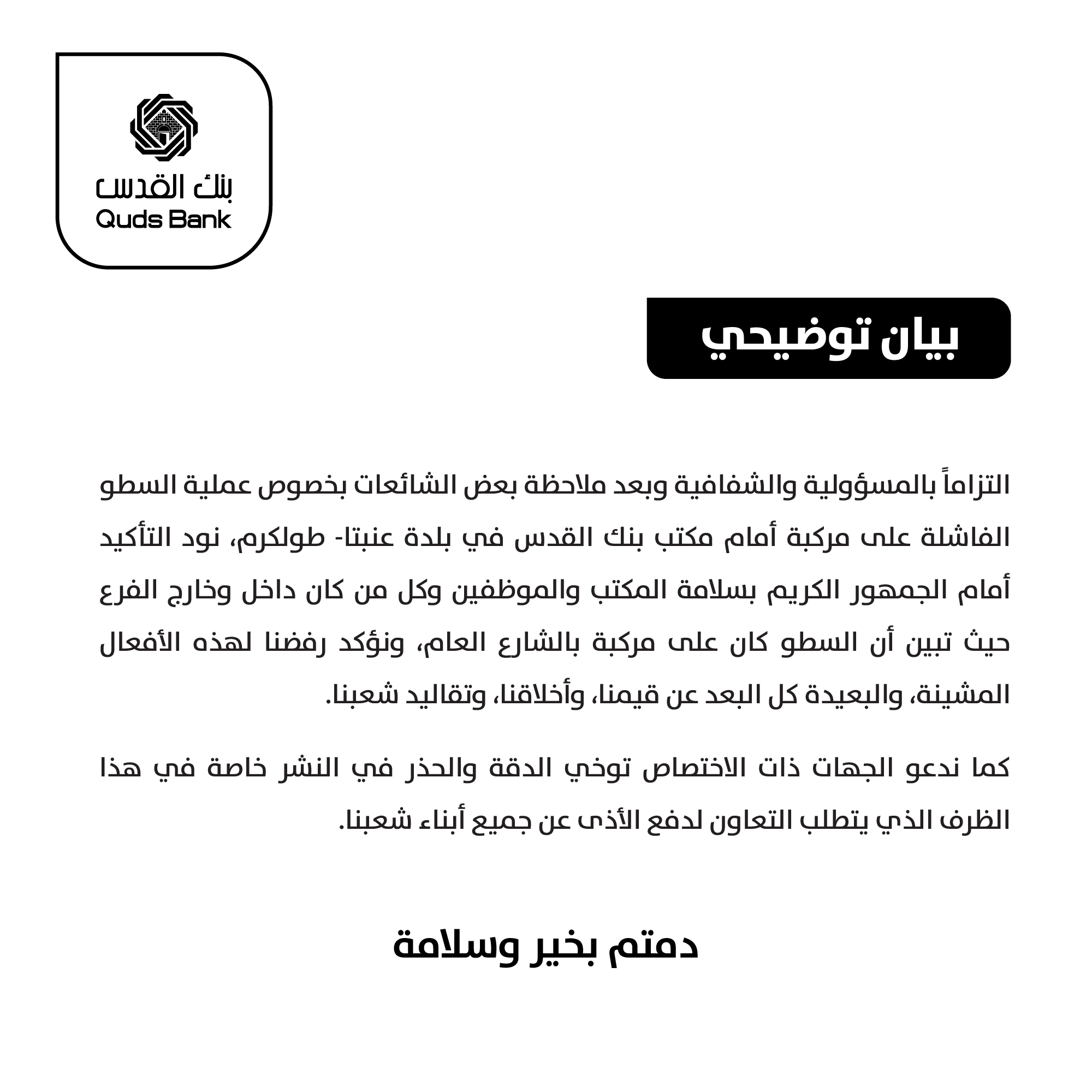 وأكد البنك في بيان توضيحي، وصل الاقتصادي نسخة منه، أن عملية السطو كانت على مركبة أمام مكتب فرع بنك القدس في عنبتا، على الشارع العام.