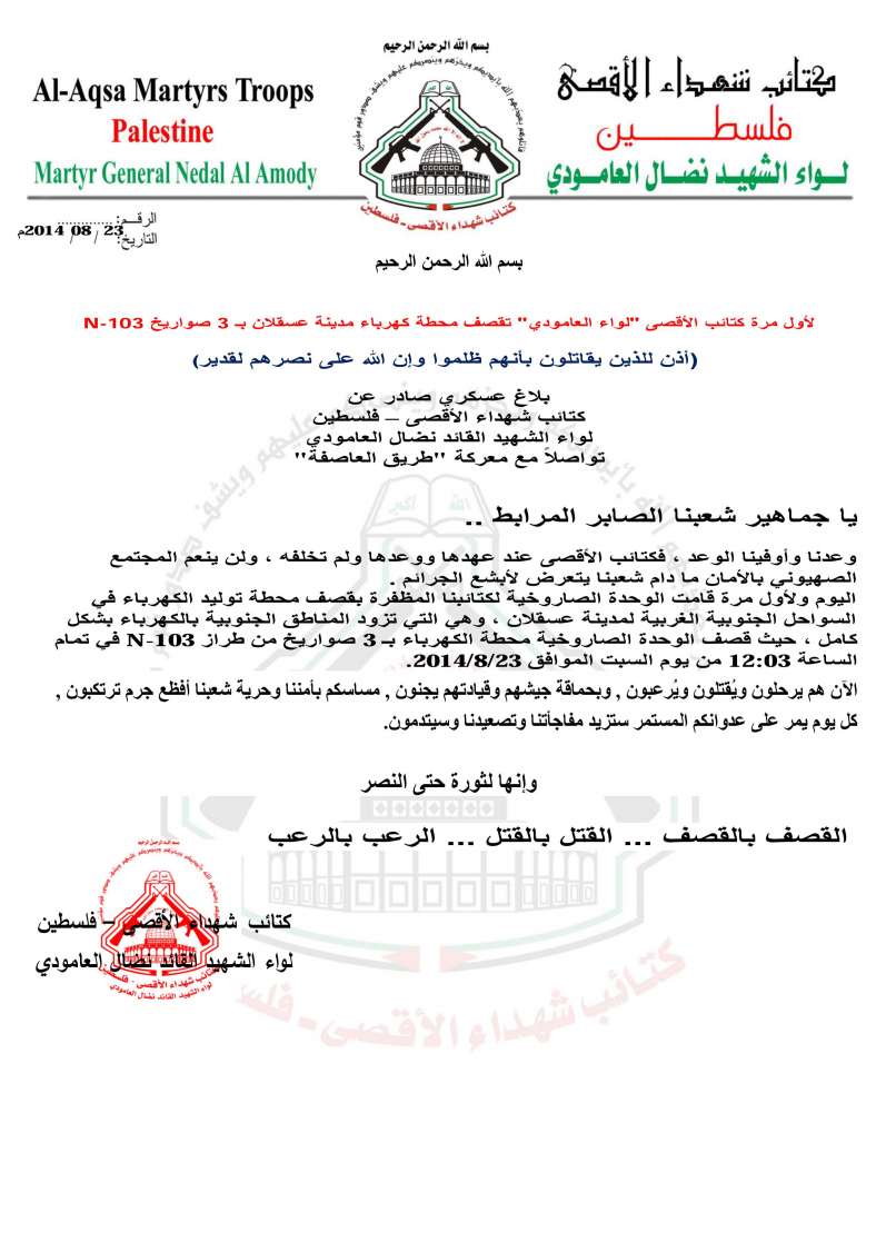 وفي سياق متصل ، أعلنت كتائب شهداء الأقصى - لواء العامودي خلال الحرب الأخيرة على قطاع غزة أنها قصفت محطة الكهرباء الإسرائيلية بعدد من الصواريخ ,ولكن الإحتلال نفى حينها.