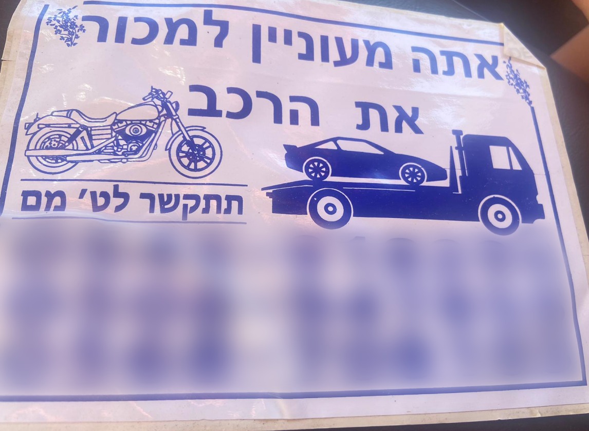الملصقات كتبت باللغة العبرية وحملت أرقام تواصل إسرائيلية، يترجم عبدالله عباراتها "هل أنت مهتم أو معني ببيع سيارتك، إذا كنت مهتما ببيعها اتصل على هذا الرقم".