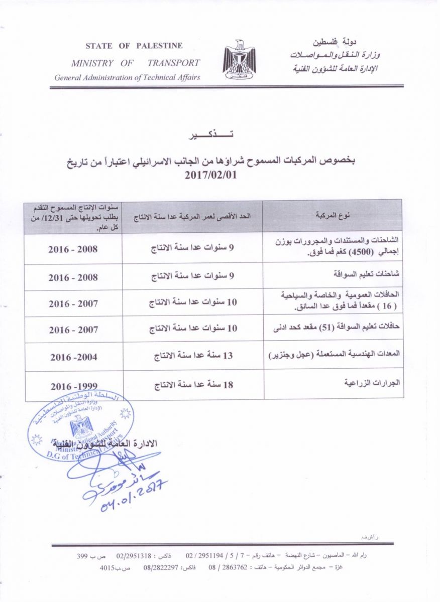 في بيانات رسمية، تحظر وزارة النقل والمواصلات الفلسطينية استيراد السيارات المستعملة من إسرائيل؛ مستندة إلى قرار منع شراء المركبات المدفوعة الجمارك من الجانب الإسرائيلي، الذي بدأ العمل به منذ أواسط عام 1997 حتى الآن.