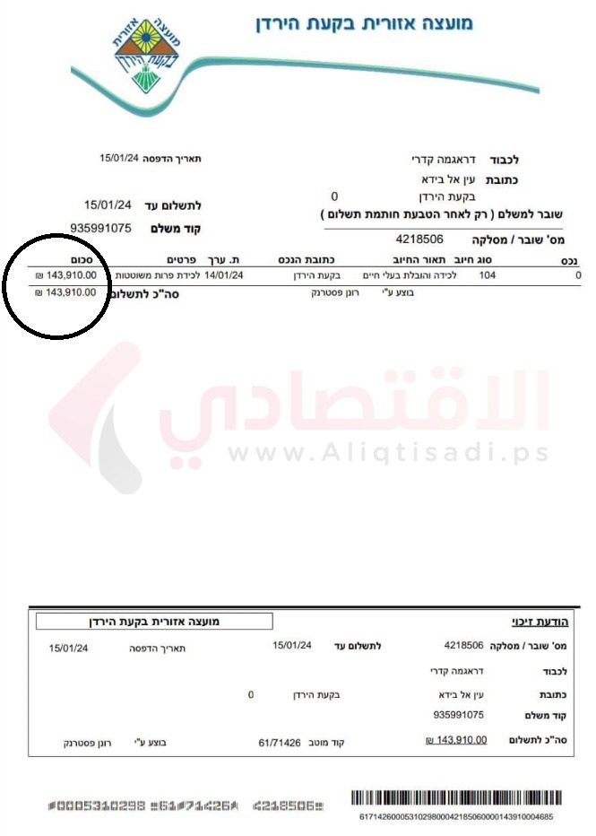 وبلغت قيمة المخالفة 143 ألف شيكل، وفق صورة للمخالفة نشرها الخبير في الشأن الإسرائيلي محمد علان دراغمة.