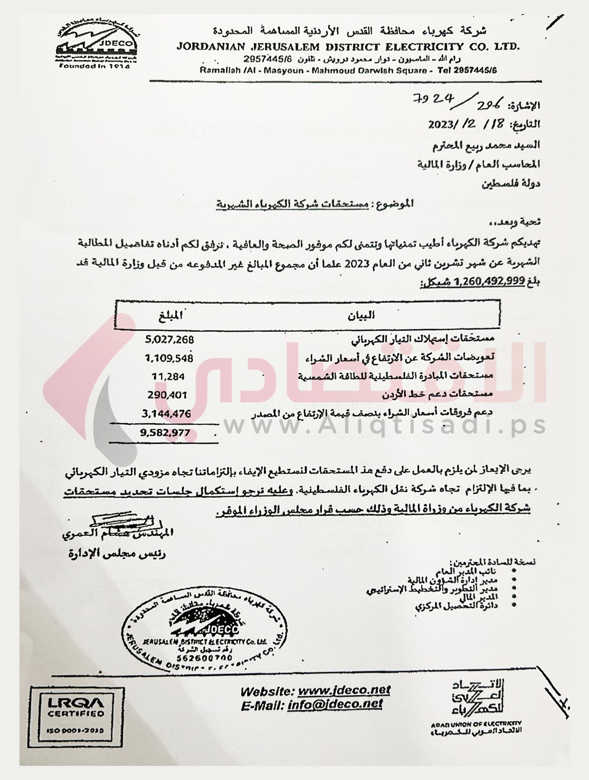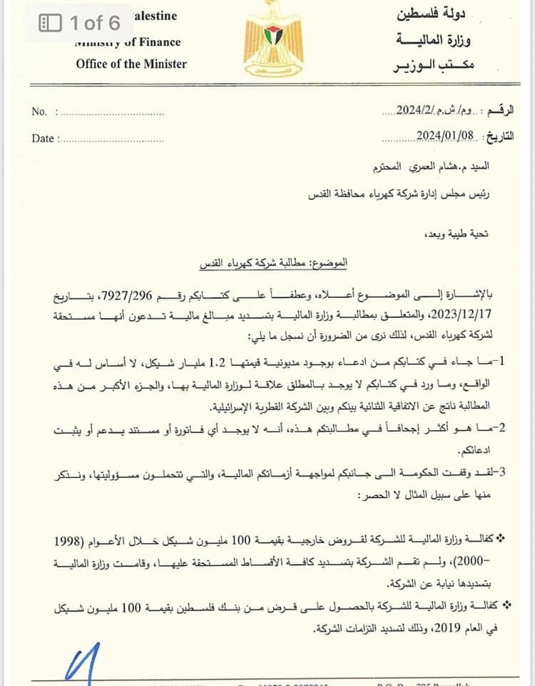 متابعة الاقتصادي - ردت وزارة المالية على كتاب وصلها من شركة كهرباء القدس يطالبها بسداد مستحقات قيمتها 1.260 مليار شيكل.