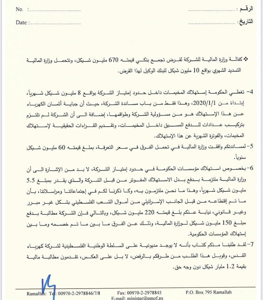 واعتبرت الوزارة أن مطالبة الشركة بمديونية 1.2 مليار شيكل لا أساس لها من الصحة، وهي ناتجة عن اتفاقية ثنائية بين كهرباء القدس والشركة القطرية الإسرائيلية.