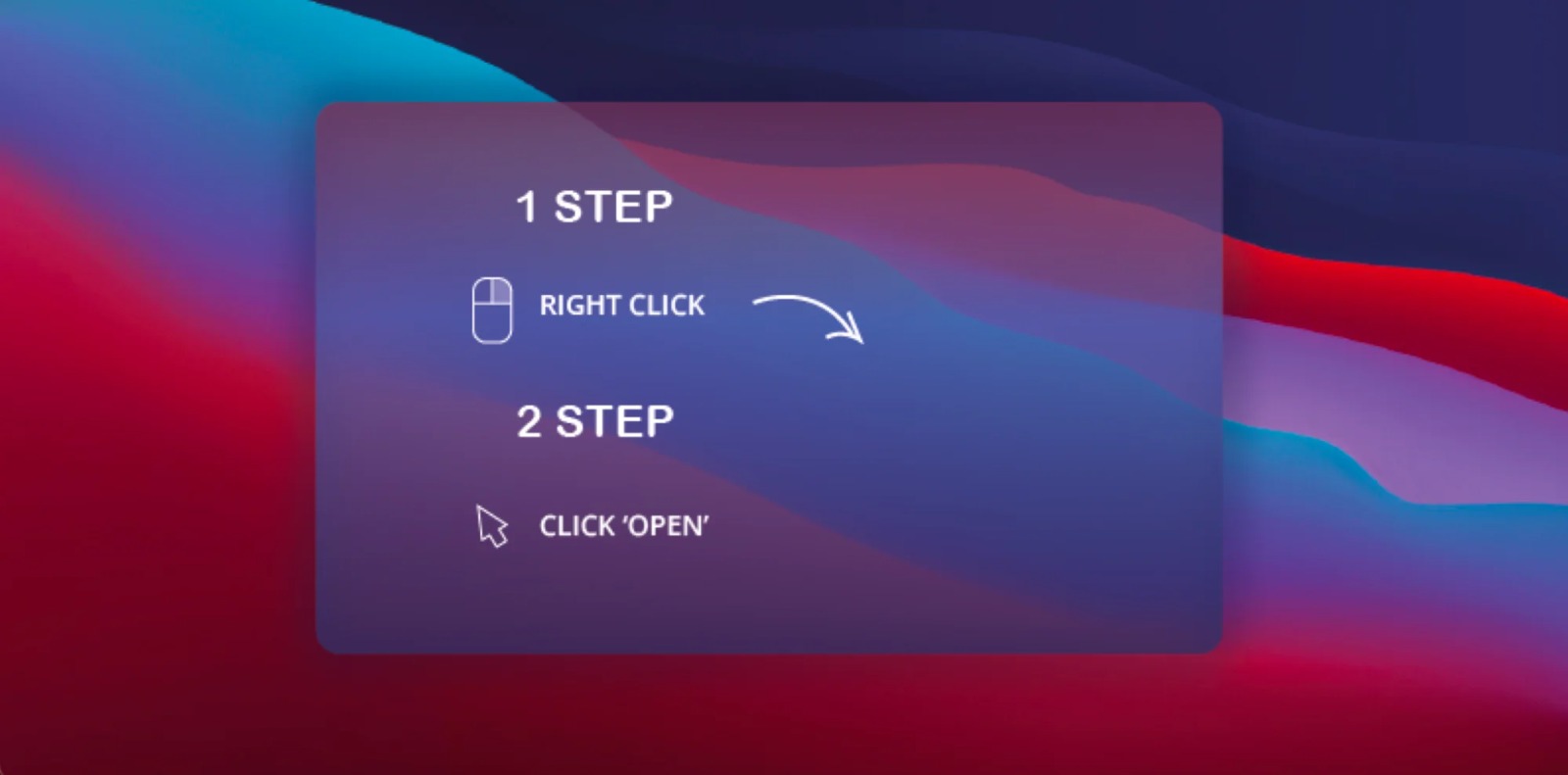 وعند إتمام تحميل حزمة الملفات الخبيثة على حاسوب الضحية، تظهر للمستخدم رسالة ترشده إلى طريقة تثبيت البرمجية وتخطي حاجز الحماية على حاسوبه، وذلك من خلال الضغط بزر الماوس الأيمن على أيقونة البرمجية، ومن ثم اختيار "افتح" Open.