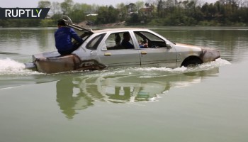 شاهد صيني يختبر سيارة برمائية صنعها بنفسه